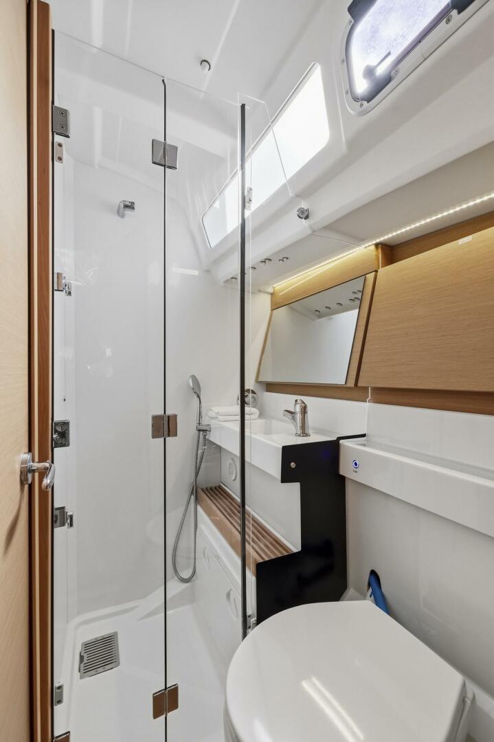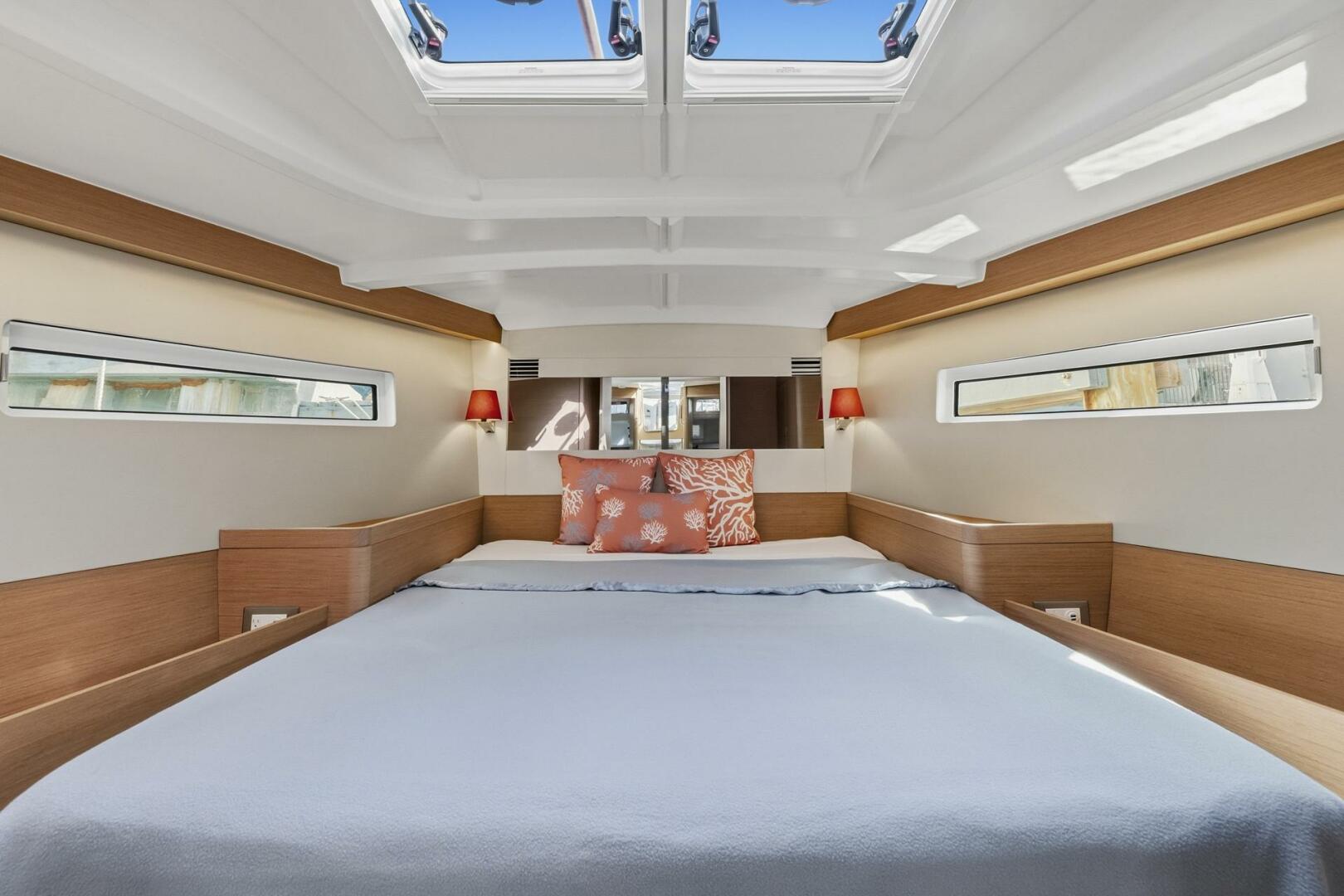 Luxury Below: Descending into a light-filled salon, below deck Dantari is appointed with light oak cabinetry. The U-shaped galley (complete with dual refrigeration, 2-burner stove, and microwave) makes onboard dining easy. The navigation station doubles as your morning coffee bar or remote office with a view. Three beautifully finished cabins, including an owner's suite featuring a private ensuite head, with 2 additional berths and another freshwater electric marine head. Dantari can comfortably sleep six ensuring everyone's comfort aboard. Each cabin is fitted with 12v fans, window blinds, and opening portholes for ventilation and lots of storage.