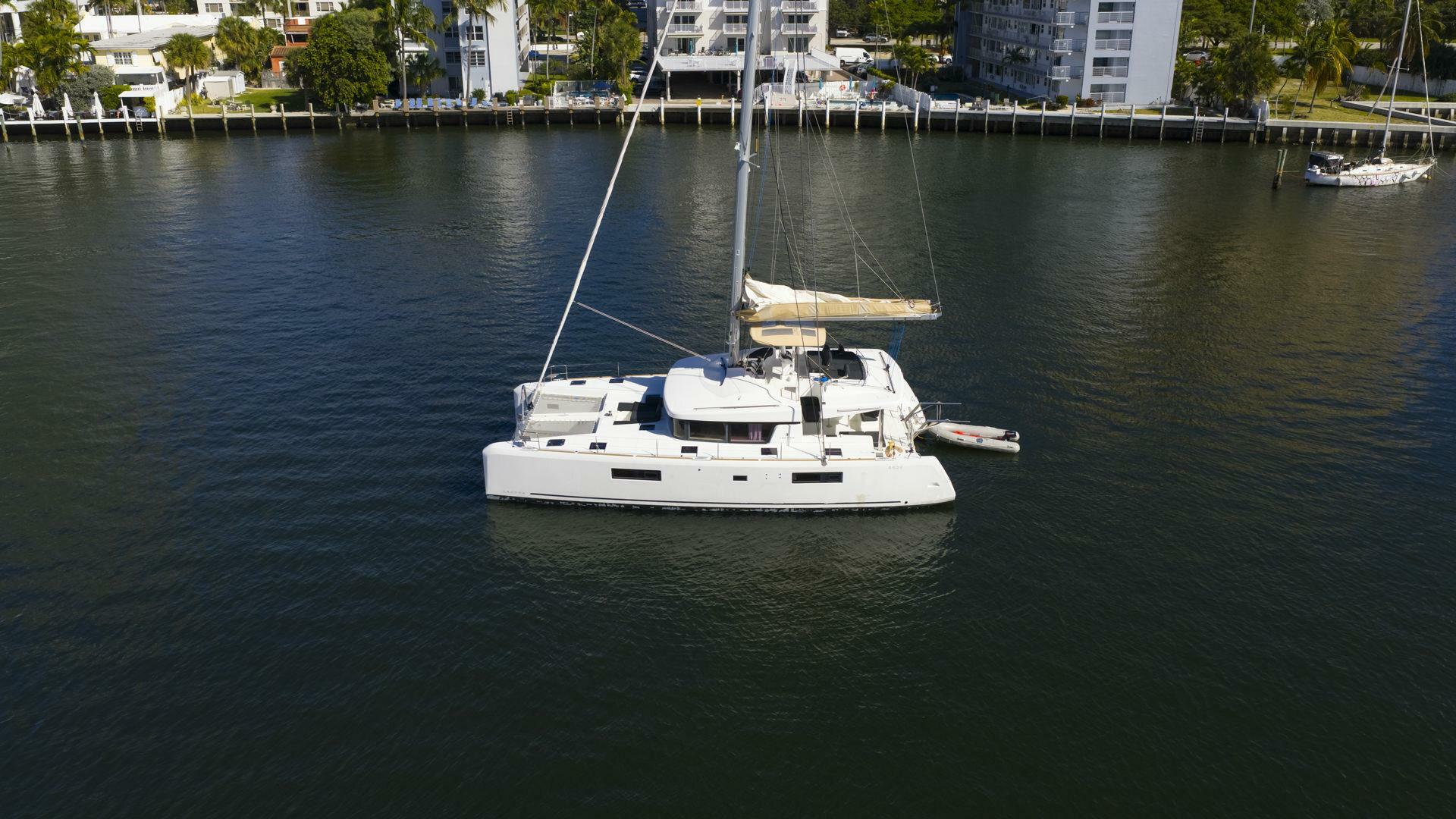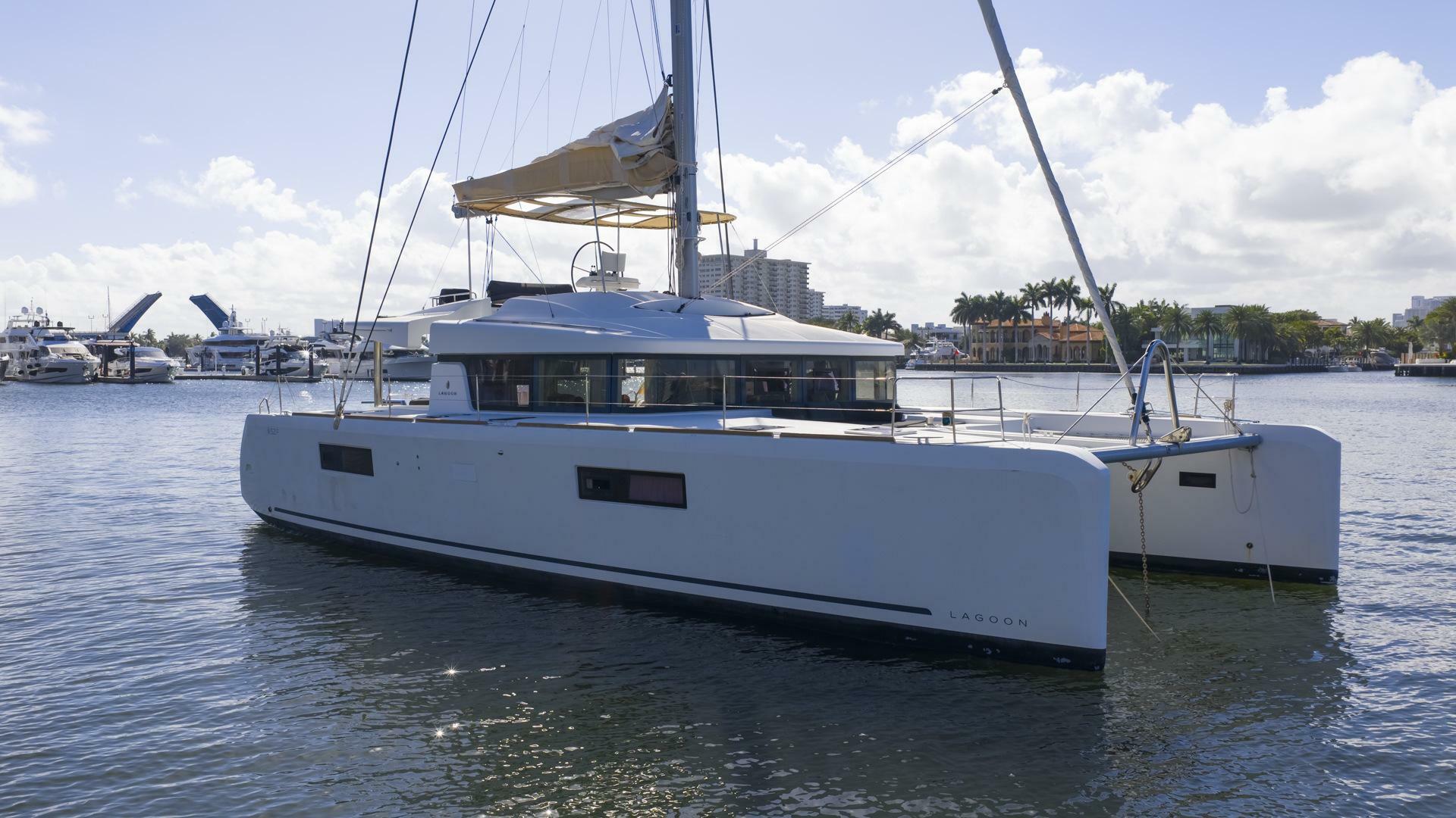 2021 Lagoon 52 Flybridge catamaran for sale. 6 ensuite staterooms, B&G electronics, twin Yanmar 57HP engines, 7kVA generator, A/C throughout, 74 GPH watermaker, full charter-ready galley, and Ocean Master tender on davits. Low hours. Priced to sell.