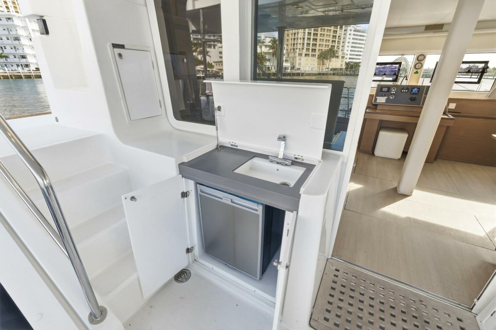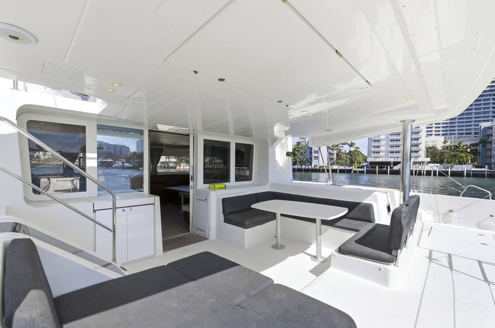 Interior: The salon benefits from Lagoon's panoramic windows and features generous seating and a flat-screen TV on an electric lift. The galley is fully equipped with full sized refrigerator and freezer drawers, an additional fridge and freezer in the portside passageway, a 4-burner cooktop, gas oven, microwave, dishwasher, and a washer/dryer combo. A watermaker producing 74 gallons per hour and a water purifying system are also onboard.