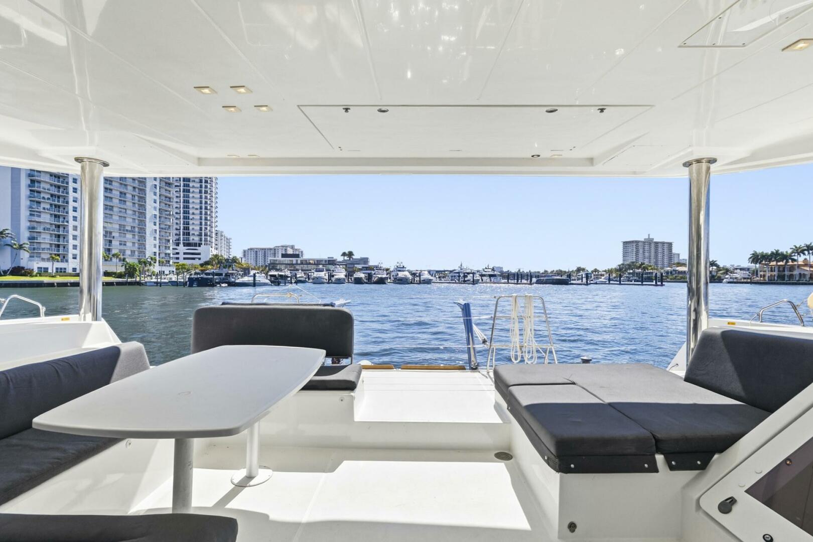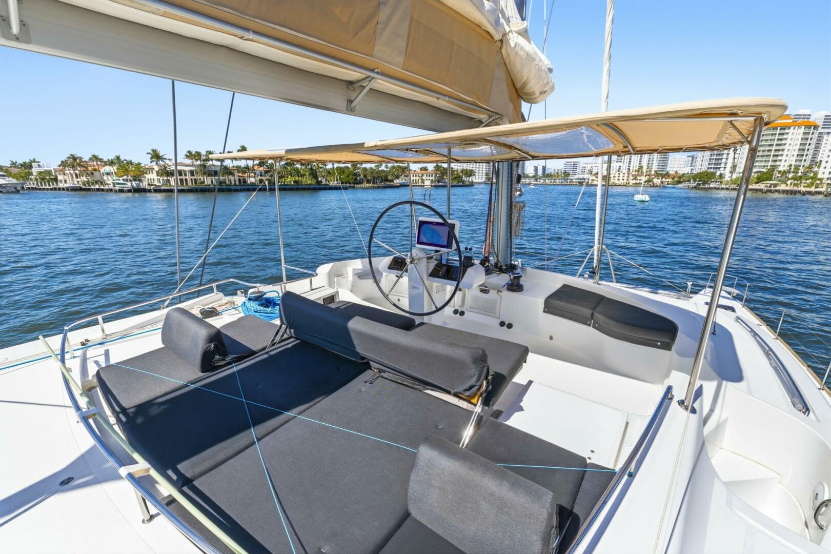 Cockpit & Exterior: The spacious cockpit offers ample seating, a wet bar, cockpit refrigerator, and Magma grill for entertaining or relaxing alone. Forward trampolines and sunpads add additional deck space. Four underwater lights and a full deck wash system (fresh and saltwater) are also installed.