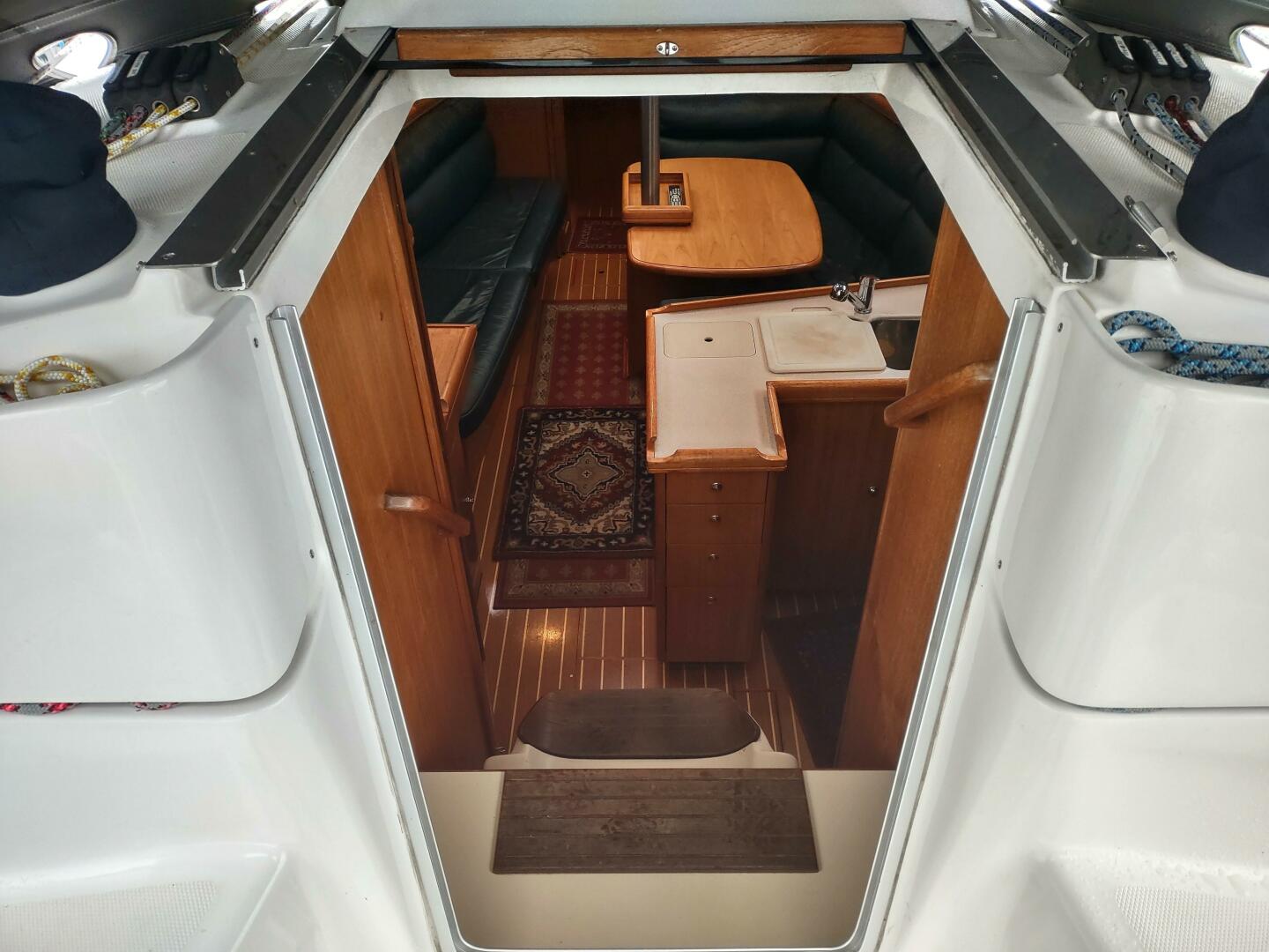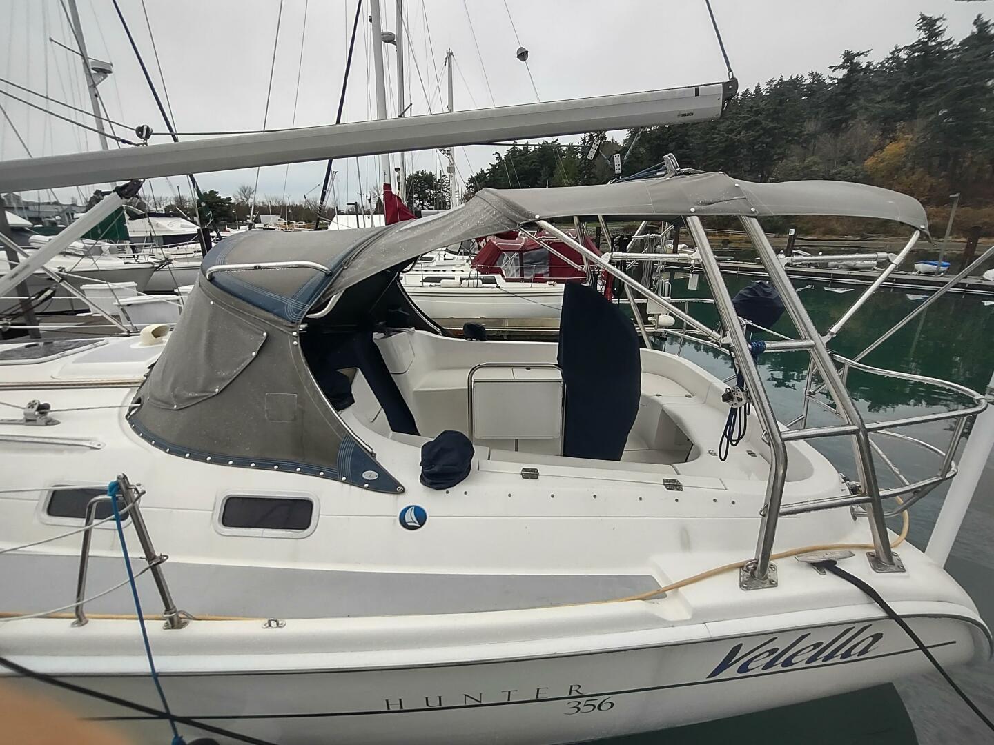 The Hunter 356 is a fine balance of practical design features that will appeal to a wide range of boaters. Over 500 of this model were built as a testament to the designs appeal. The hull is easily driven under power or sail and features an easily managed roller main and jib, a large covered cockpit with ample seating and storage, a convenient walk thru transom, a functional galley, a plush salon, a vee berth forward and a queen size berth aft. For a 35' boat the Hunter 356 Velella has a lot to offer. This beauty has been well cared for by her experienced owner of the past 11 years. Special features include;