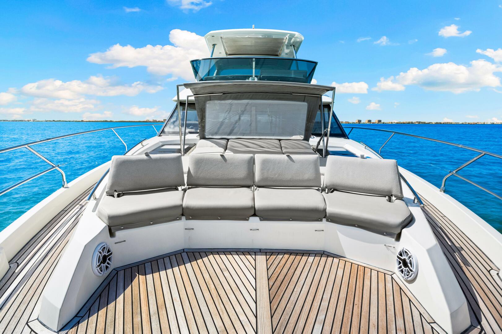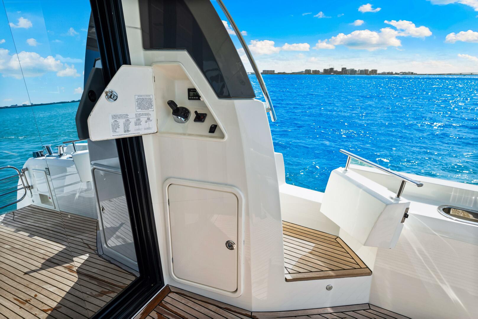 - Helm with Raymarine Chartplotter, Windlass Controls, Engine Throttles, Maneuvering Joystick, Compass, (12V) Plug, Cup Holders, Searchlight Remote and Storage Compartment