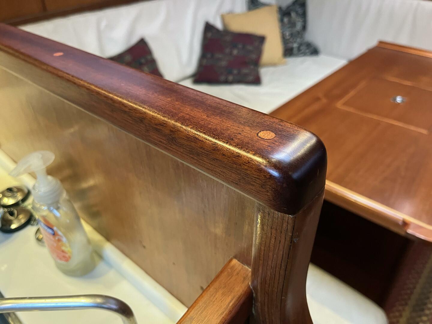 The spacious salon includes a large U-shaped settee to port surrounding a fixed dining table with integrated storage. To starboard is a sea berth with ample storage below and outboard. Many lockers, shelves, and under-settee storage create excellent capacity for provisions and cruising gear.
