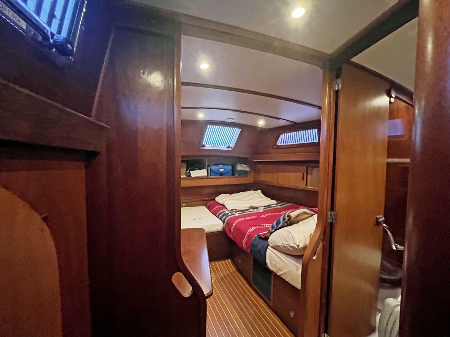 In the passageway aft from the salon to the aft cabin there is a pilot berth outboard along the hull side. There is also a access door to the engine room.