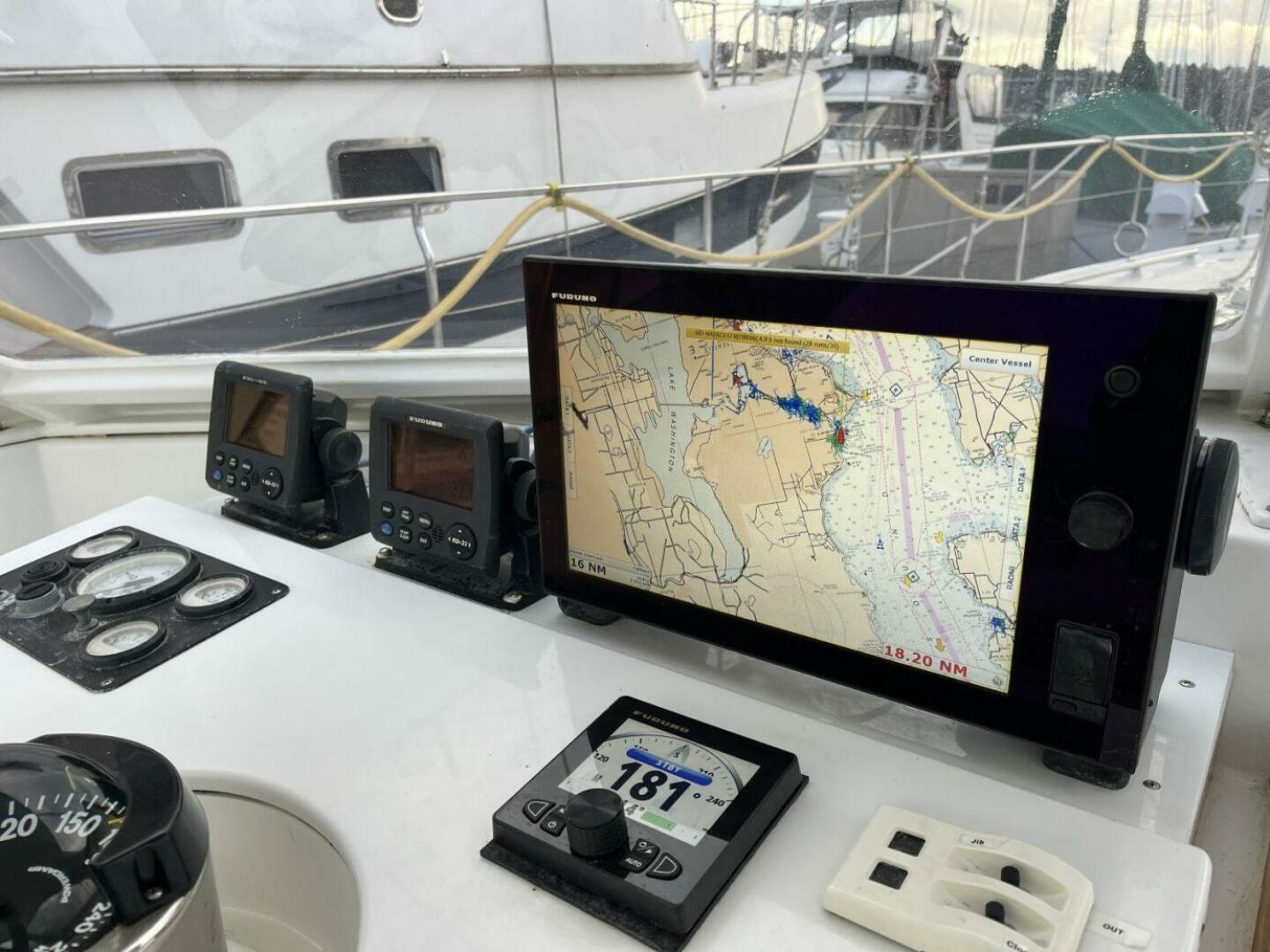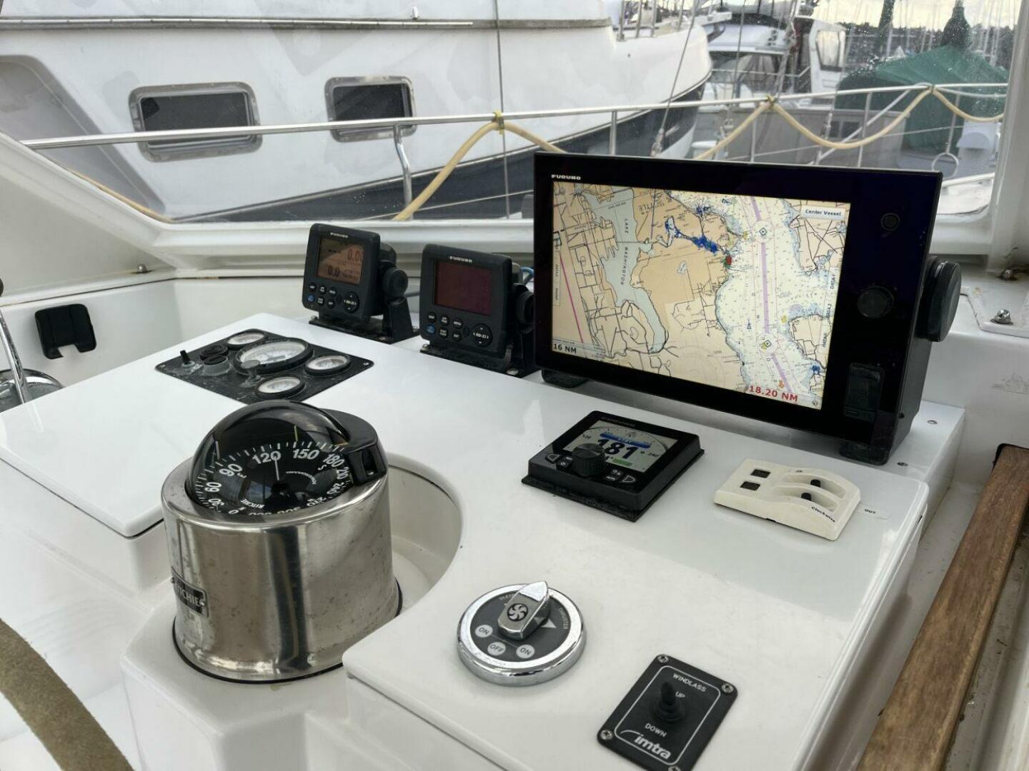 A dedicated nav station is positioned to starboard and aft of the salon. The full-size forward facing L shaped chart table provides organized space for navigation tools, radios and instruments.