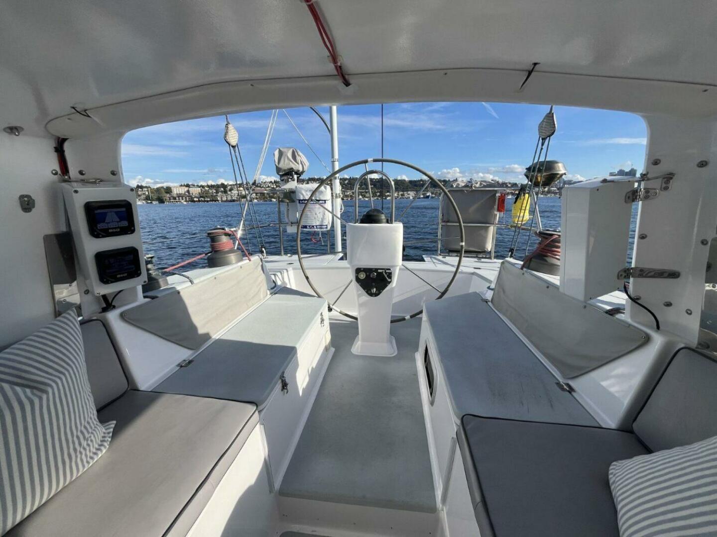 On deck, the Apogee is designed for safe offshore sailing. Wide side decks, robust stainless stanchions and pulpits, and high coamings in the cockpit give excellent security. The cockpit is deep and protected by a hard dodger, with comfortable seating for both passagemaking and harbor lounging. There is an opening window at the front of the dodger and lights beneath. The mainsail is sheeted to the traveller on the dodger top, providing the benefits of end boom sheeting without the traveller interfering with the cockpit. A drop curtain can be installed at the aft end of the dodger, turning the forward end of the cockpit into a enclosed pilothouse. Halyards are controlled on deck amidships, with a electric winch making BITTERSWEET manageable for a couple or small crew.