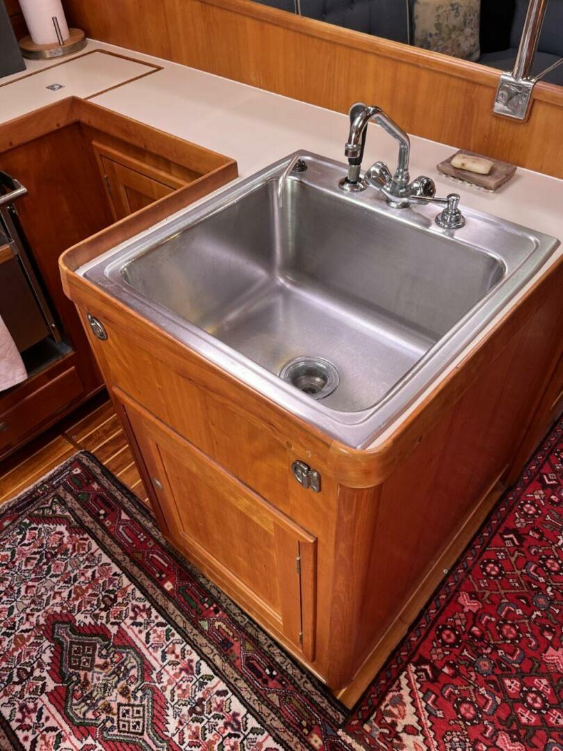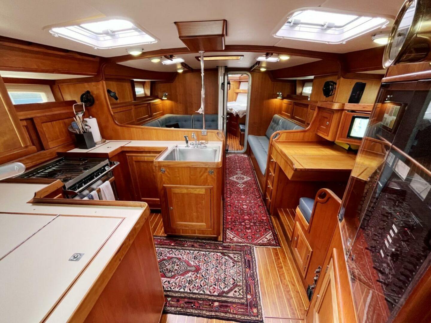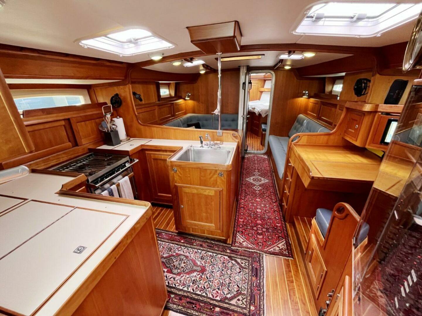 - Galley: C-shaped to port, ideal for use underway. Features include deep stainless sink, gimbaled stove/oven, large separate refrigeration and freezer, and abundant counter and locker storage. Large hatch overhead for good ventilation. Force 10 propane three burner stove/oven