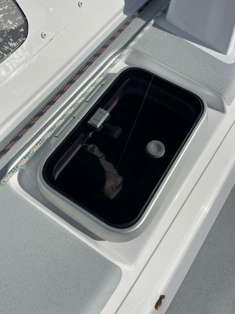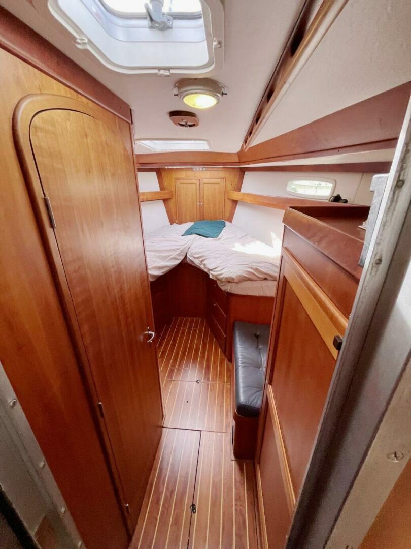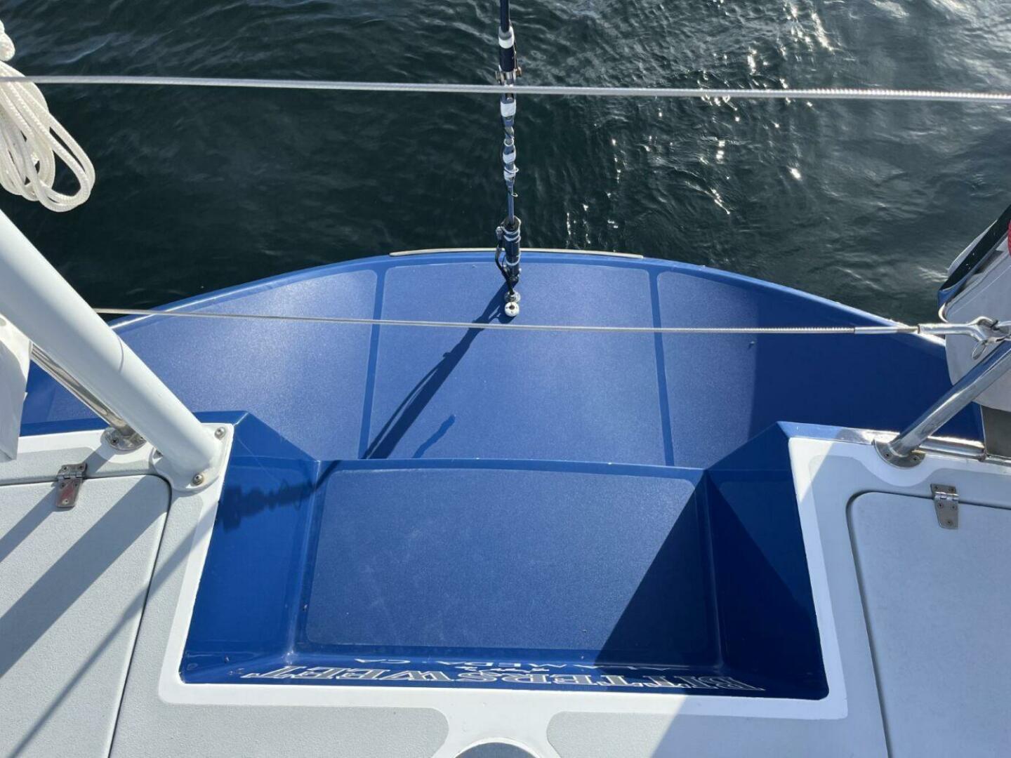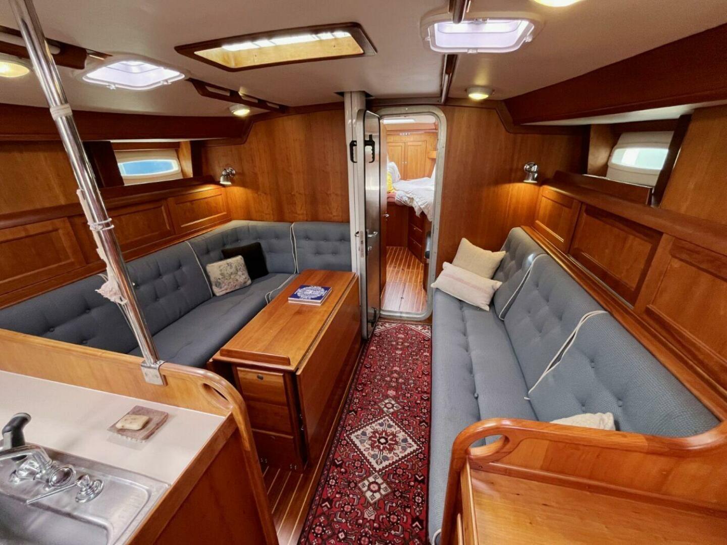 - Main Saloon: Port and starboard settees (L shaped settee to port and two straight settee’s to starboard) flank a centerline drop-leaf dining table, creating a comfortable gathering space. There is ample storage and good ventilation. Lee cloths are fitted on the salon berths.
