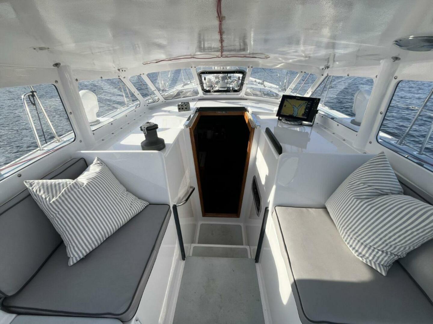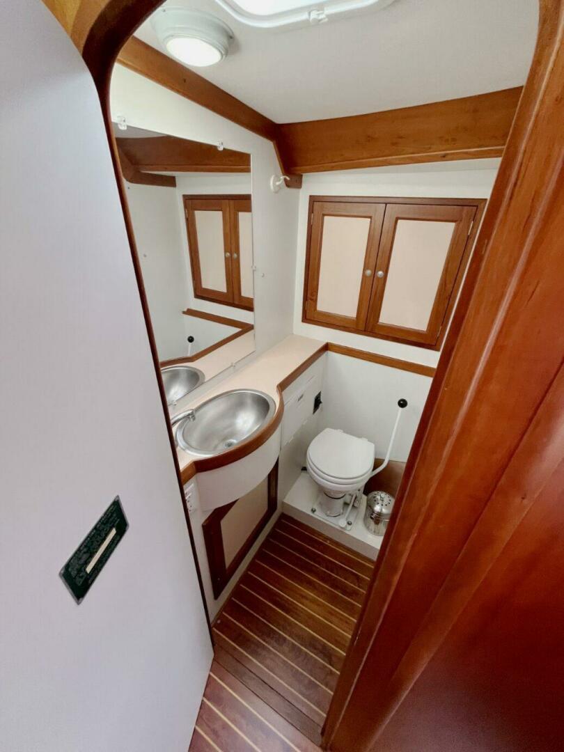 The interior of BITTERSWEET reflects the high standards of Maine craftsmanship. Her beautiful cherry joinery is finished in satin varnish and was recently refinished. Numerous opening hatches and ports ensure excellent ventilation and natural light throughout. Her interior features two staterooms and two heads and sleeps six including her two salon berths. Watertight doors separate the forward cabin and the engine room/garage space aft, adding a extra measure of safety.