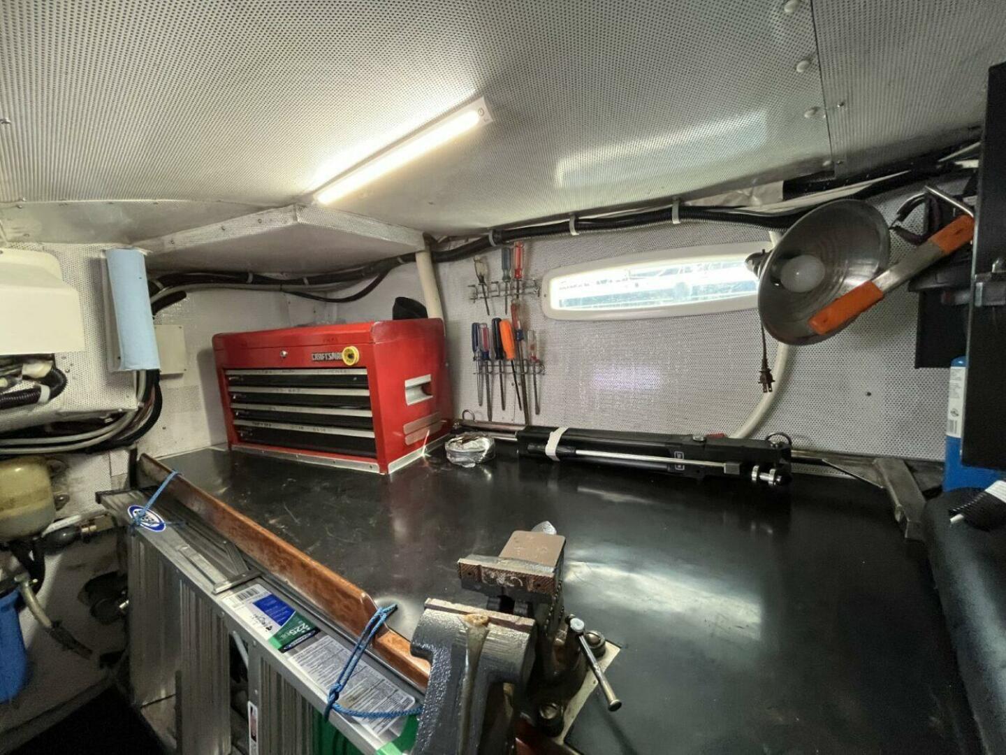- Garage/engine room: Watertight door with work bench and storage space, excellent access to engine and steering gear.