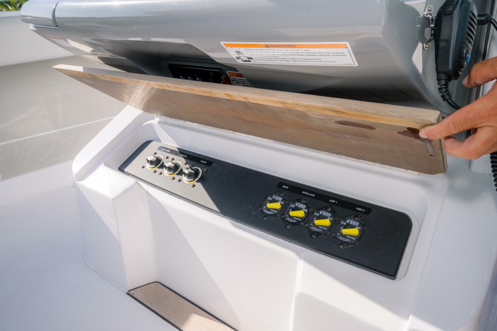 - Teak Helm Footrest with Battery Switch and Breaker Access
