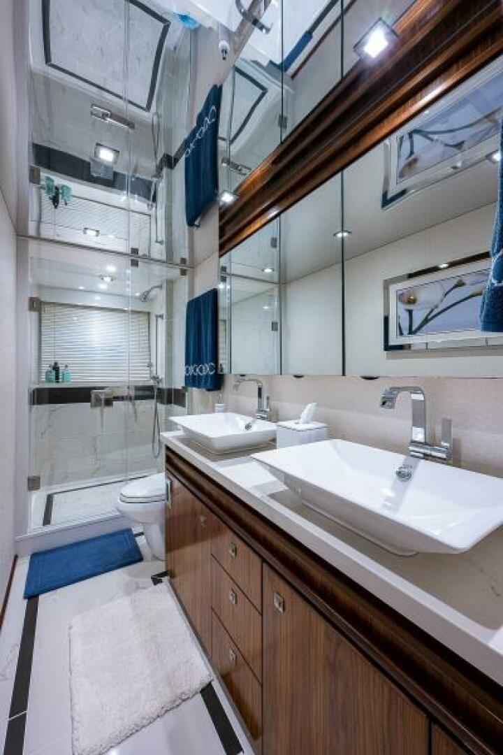 Maxwell RC12 hydraulic anchor windlass, upgraded polished stainless steel anchor, hydraulic swim platform, SEAKEEPER SK26 gyro stabilizer, 1400 GPD watermaker with auto backflush, power distribution system with touch screen controls in salon, crew area, and on flybridge, Veem interceptor propellers
