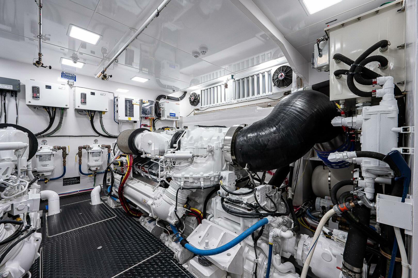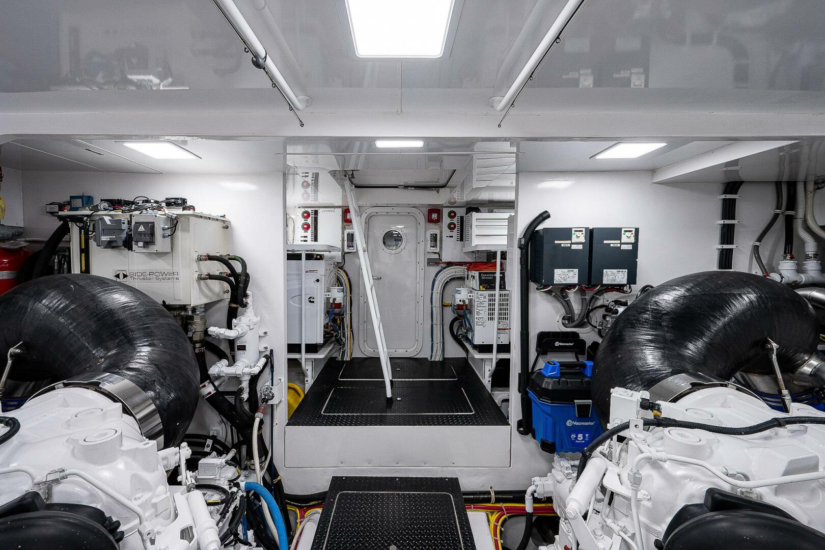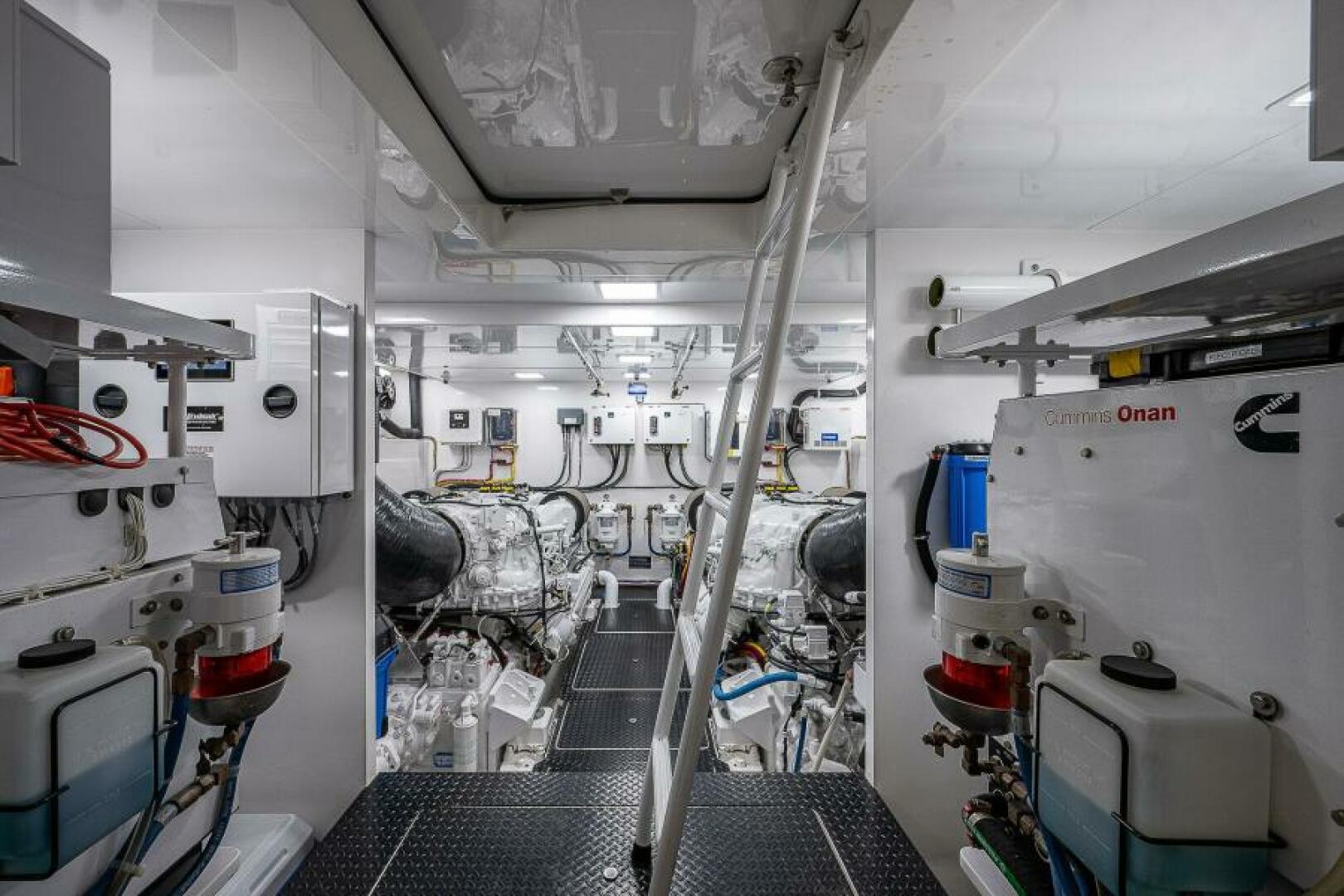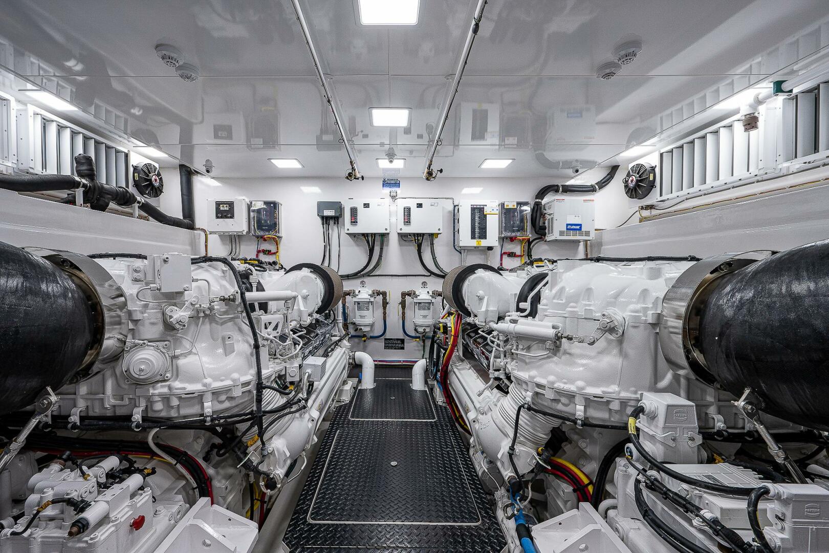 (2) 12V2000 M96L diesel engines (1150 hours) with dynamic positioning joystick and EXTENDED WARRANTY COVERAGE UNTIL 10/31/2026 or 1583 hours, (2) 29KW Onan generators (815 and 820 hours), DELTA T ventilation system, fuel priming pumps, fuel transfer system, oil change system for engines, transmissions, and generators with exterior pump out, central sea water system, fresh water in engine room, dual Racor fuel filters, Tides dripless shaft seals, Glendenning Cablemasters for 100A cords, back up fuel transfer and sea water pumps, storage shelves over both generators, tool box