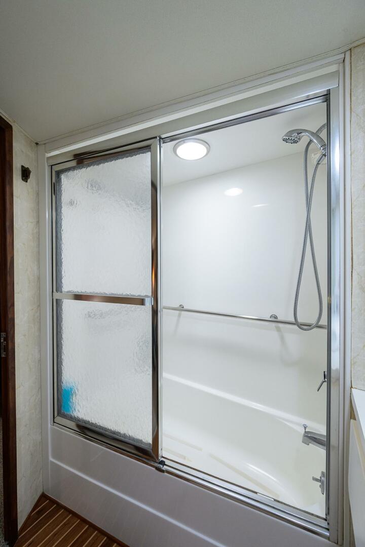 - The forward stateroom features bunk beds, overhead hatch, and another full size head.