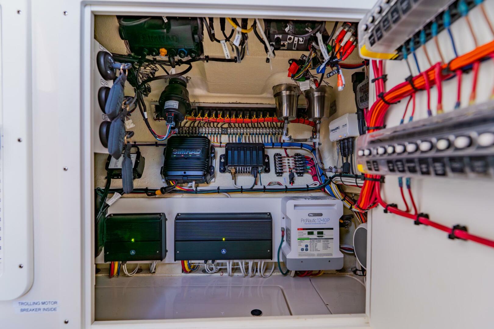Equipped with a full Simrad electronics package, a second station with complete helm controls, and a 108” Rhodan trolling motor with a dedicated battery charger, this boat is equally capable for serious offshore fishing and relaxed family sandbar days.