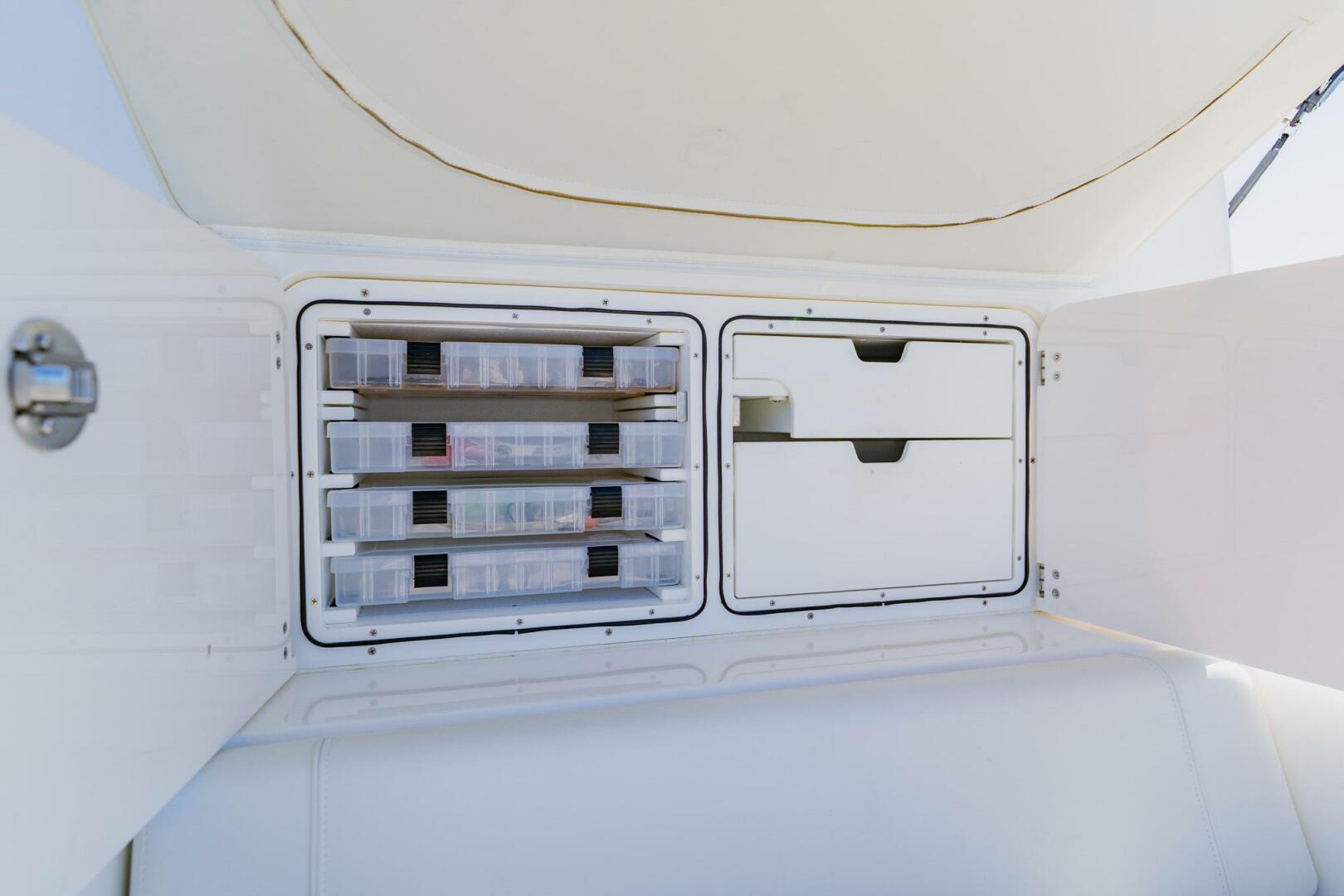 Deluxe rear-facing mezzanine seat with fixed cooler and tackle station side doors