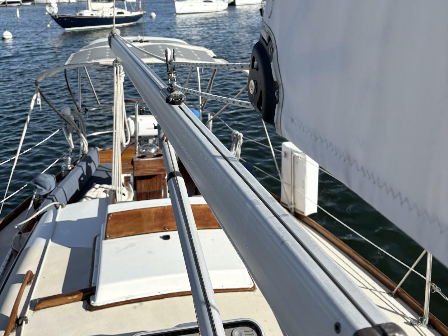 4 winches at the cockpit, two Lewmar 46 and 2 Lewmar 16s, provide easy handling of multiple sails. 2 winches, on the port and starboard side of the mast, manage halyards and topping lift. There is a rigid boom vang.