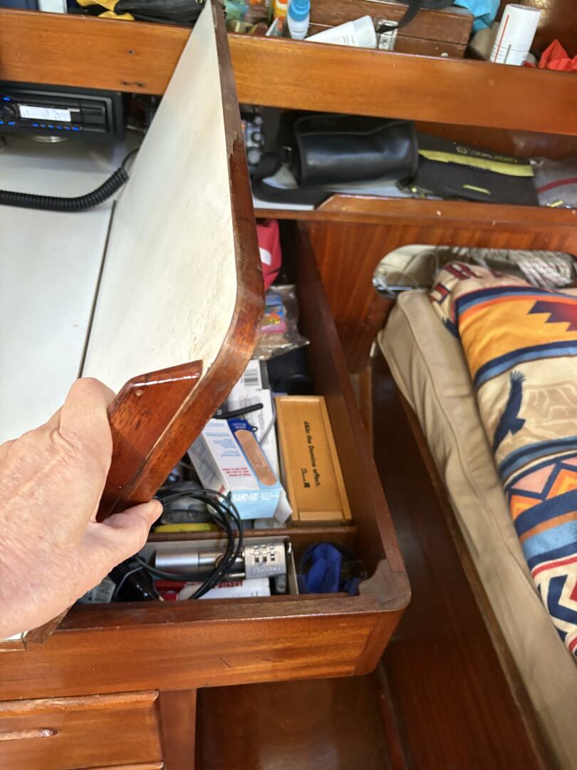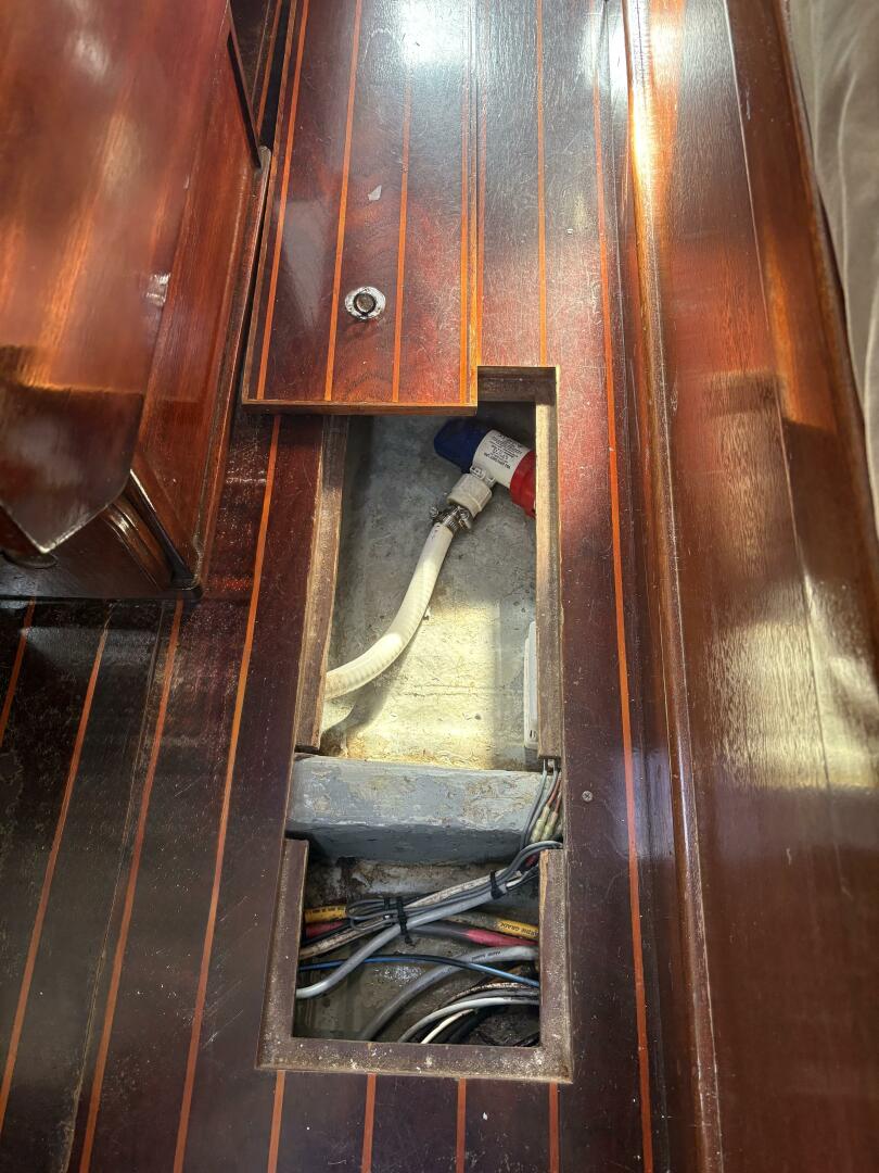 Accomodations include a v berth with room for 2, 2 salon settees, and 2 pilot berths above the salon settees which can be used as sleeping quarters or storage. Additional storage is accessible in the settees. There is an additional quarter berth aft. 3 dorades and 2 Carafamo fans provide ventilation along with opening ports and hatches. The sole is teak and holly. A large salon table has 2 leaves, with storage for wine bottles in the center and additional storage below. All cushions are in very good condition.