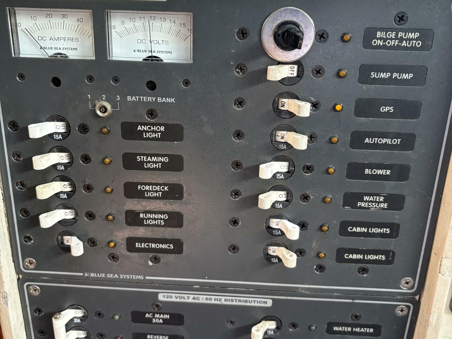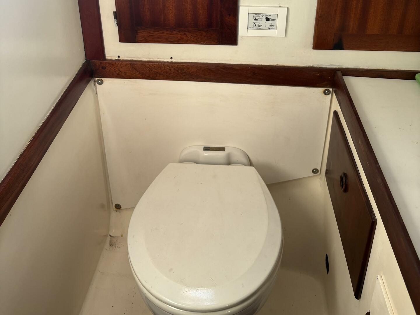The head has a Rarian Elegance macerating electric head, and a sink with new pull-out faucet/shower. There is a 20 gallon holding tank. Hot and cold water are supplied by the water heater, heated by the engine or by the 12 volt system.