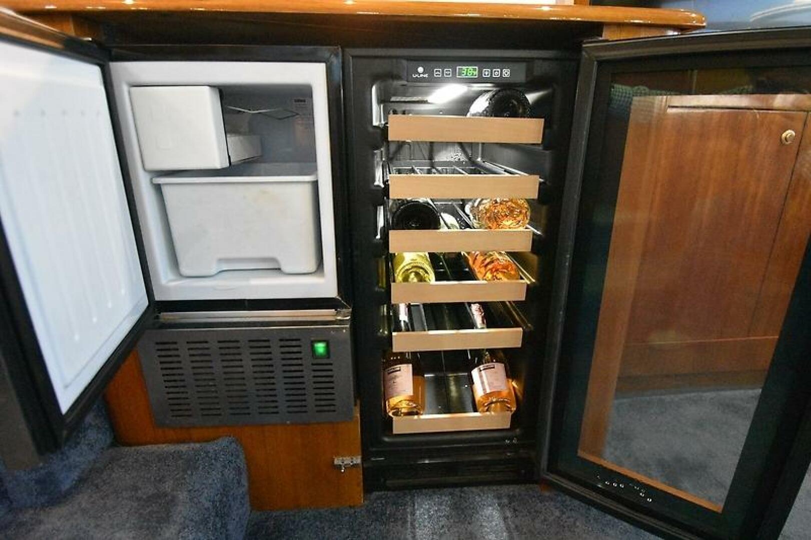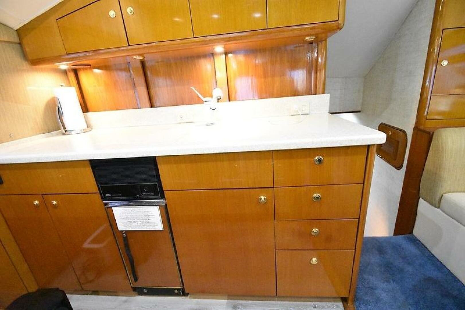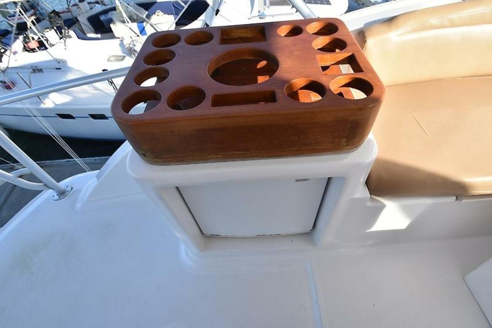 Built on the same hull as the 53 Super Sport the Ocean 52 is an impressive blend of performance, fishability and cruising elegance. Designer David Martin has created an exceptional accommodation which include three staterooms and three full heads. The forward cabin has a walkaround double berth and private head in the forepeak, while the full width master stateroom is aft down a few steps from the hallway where its located beneath the elevated galley and dinette. The third stateroom is to port with hi-lo berths and adjacent head. On deck, the cockpit comes with all of the fishing amenities expected in a serious tournament machine. Additional features include a well designed helm console with undated electronics, a built in washer dryer and a fiberglass hardtop.