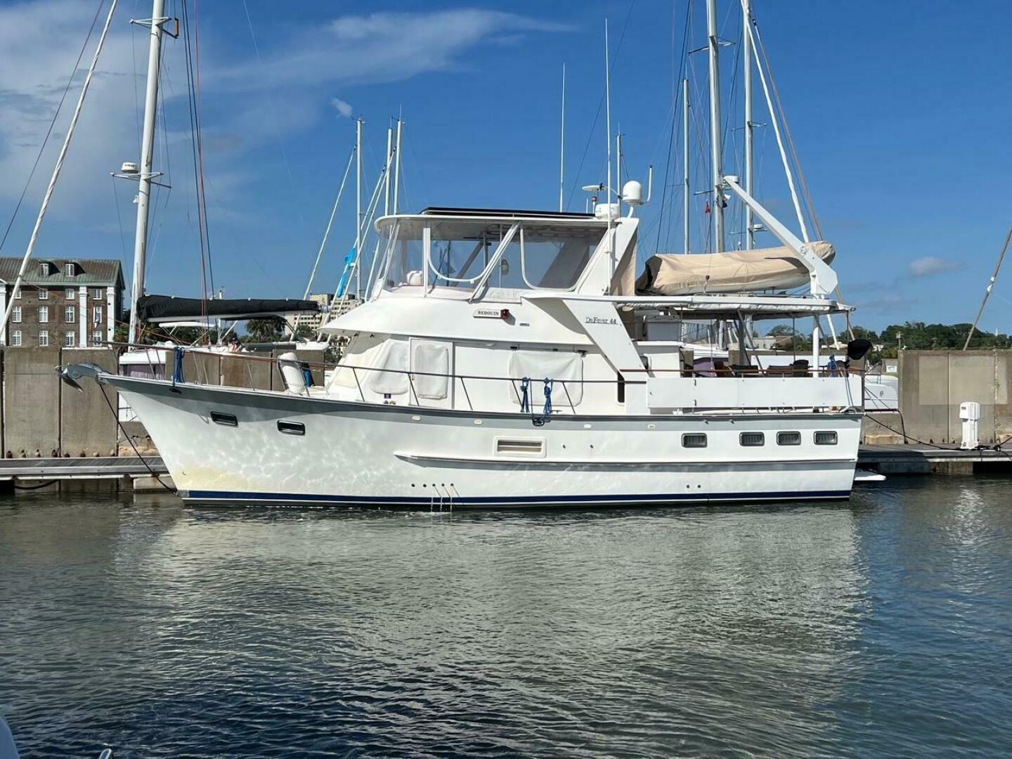 COMMENTS: This DeFever Offshore Cruiser is a well maintained and sturdy vessel. She offers 2 staterooms, 2 heads, twin Perkins 135 hp naturally aspirated main engines, bow thruster, 6 solar panels, 12.6 kw Westerbeke generator, and 2500-watt inverter/charger. The upper helm is covered with a custom fiberglass hard top. This vessel is capable of doing the Americas Great Loop as the air draft can get down under 19 feet.