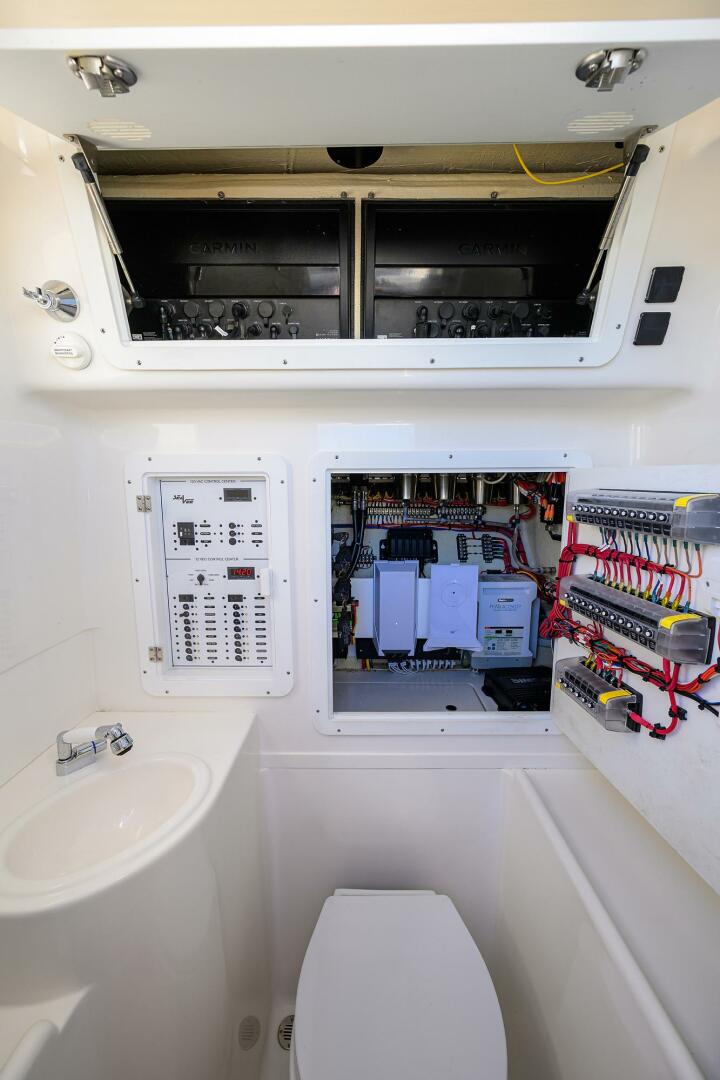 - Console and Helm: Walk-in console with side-sliding door, freshwater sink and shower, helm station with electronic battery switches, customizable for Garmin electronics (common in 2023 models).
