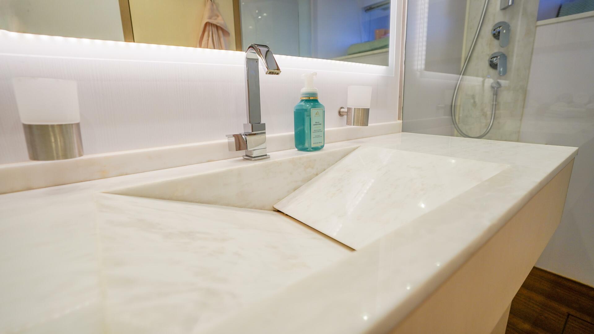 - Stone/marble countertops (galley, salon, heads, cockpit tables)