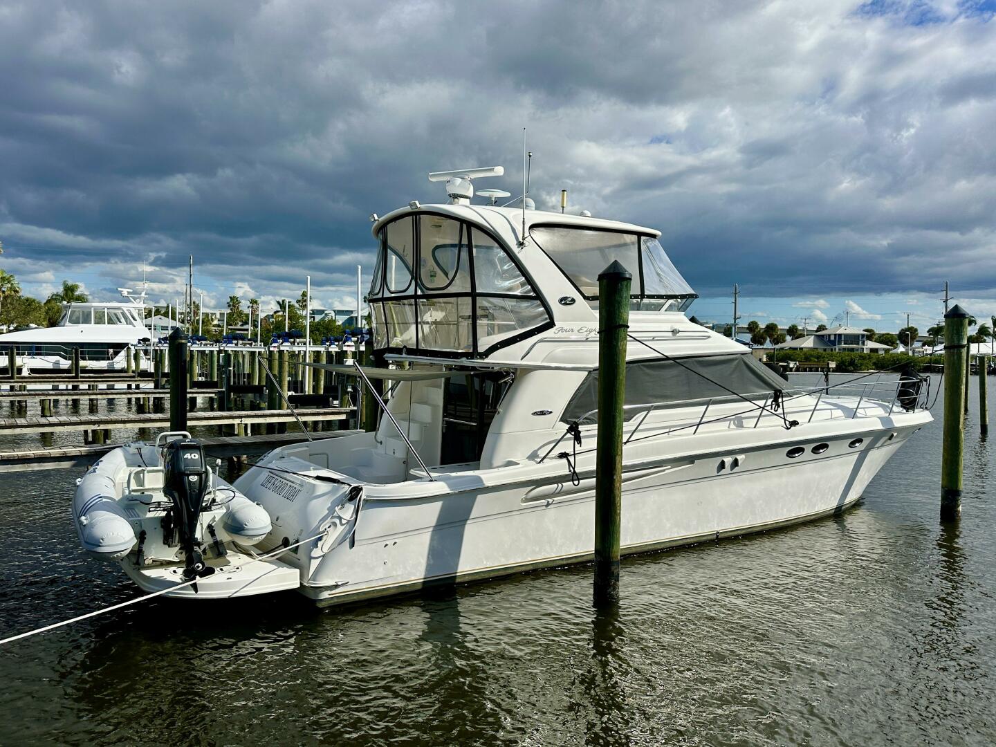 An incredibly well equipped 480 Sedan Bridge, with loads of important maintenance and upgrades that should put this boat at the top of your list. Owned by knowledgable boaters, “Life Is Good Today” is set up to cruise or stay on the hook for days at a time. Powered by twin Cummins QSM11's, she also has a hydraulic swim platform with tender, bow and stern thrusters, all new Raymarine electronics, water maker, inverter, washer/dryer combo and more. This boat has everything that you need!