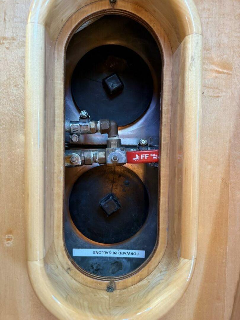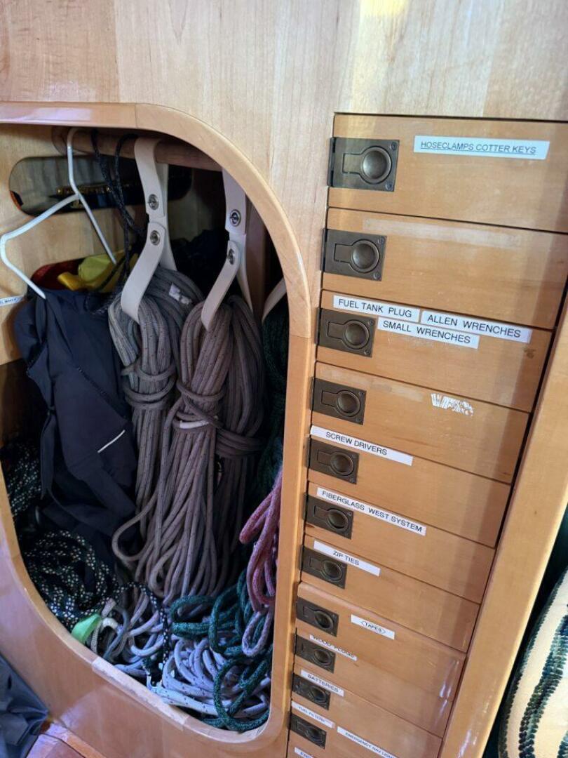 Aft of the settee on port is more food storage area and a unique gimbaled counter space that is perfect for food prep underway and a gimbaled three burner propane Force 10 oven/stove. Forward of the main salon on port is a large head with stainless steel sink and shower. On starboard is well organized storage area thoughtfully designed with work bench area and cabinet storage above and drawer storage below. Forward is a dedicated anchor locker, with a crash bulkhead.