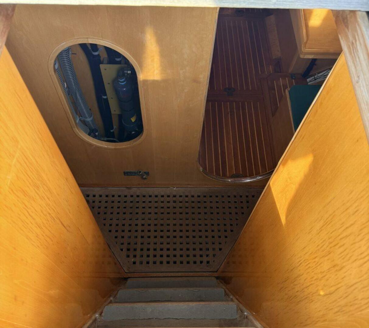 Easy access to the engine located mid ship below the island. Aft of the settee on starboard is an engine-driven refrigerator/ice box. Continuing aft on starboard is a forward-facing large navigation station with breaker panel outboard.