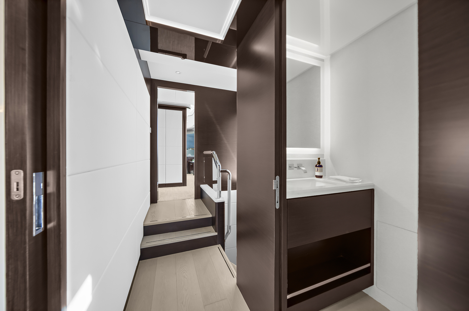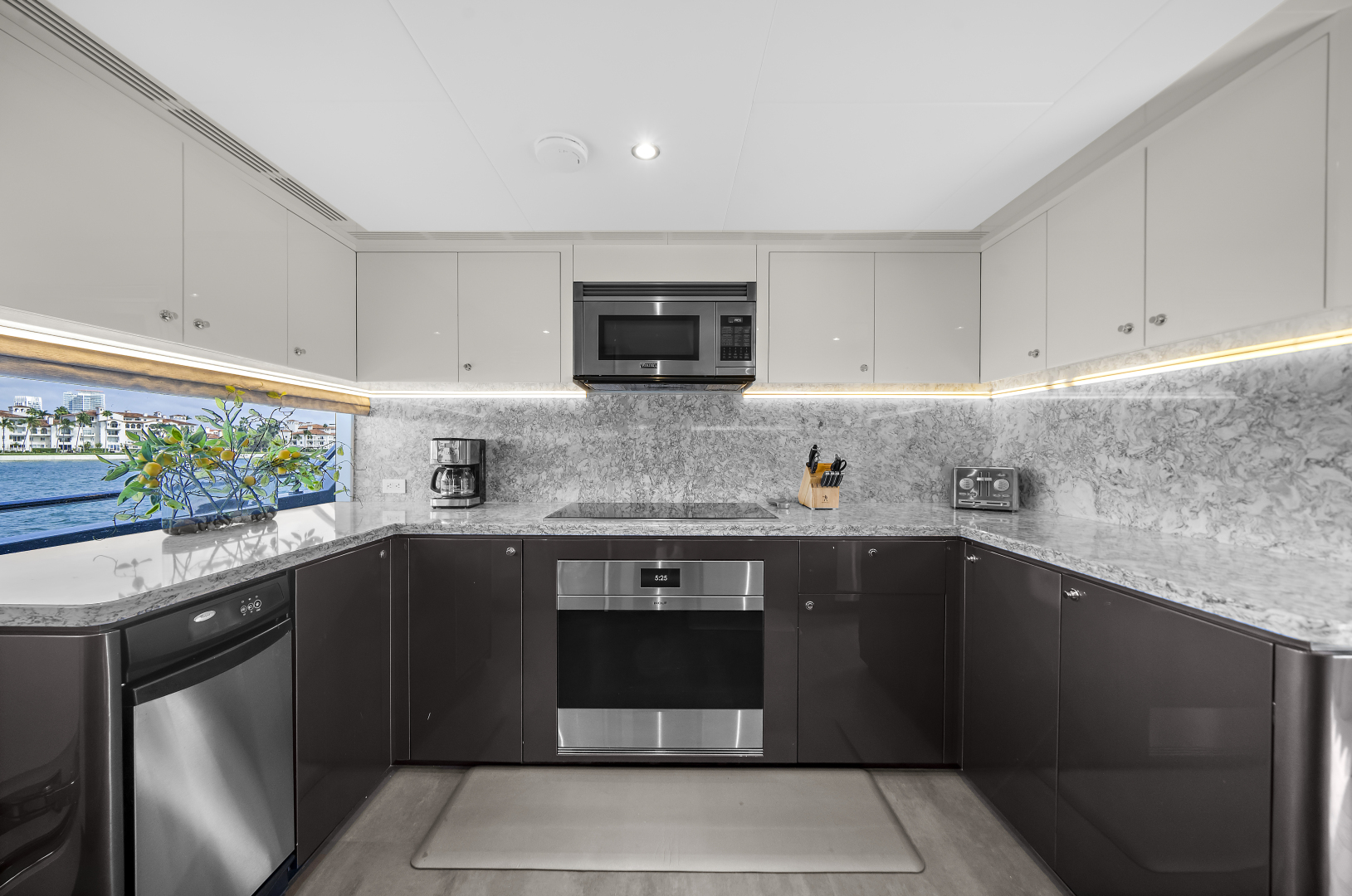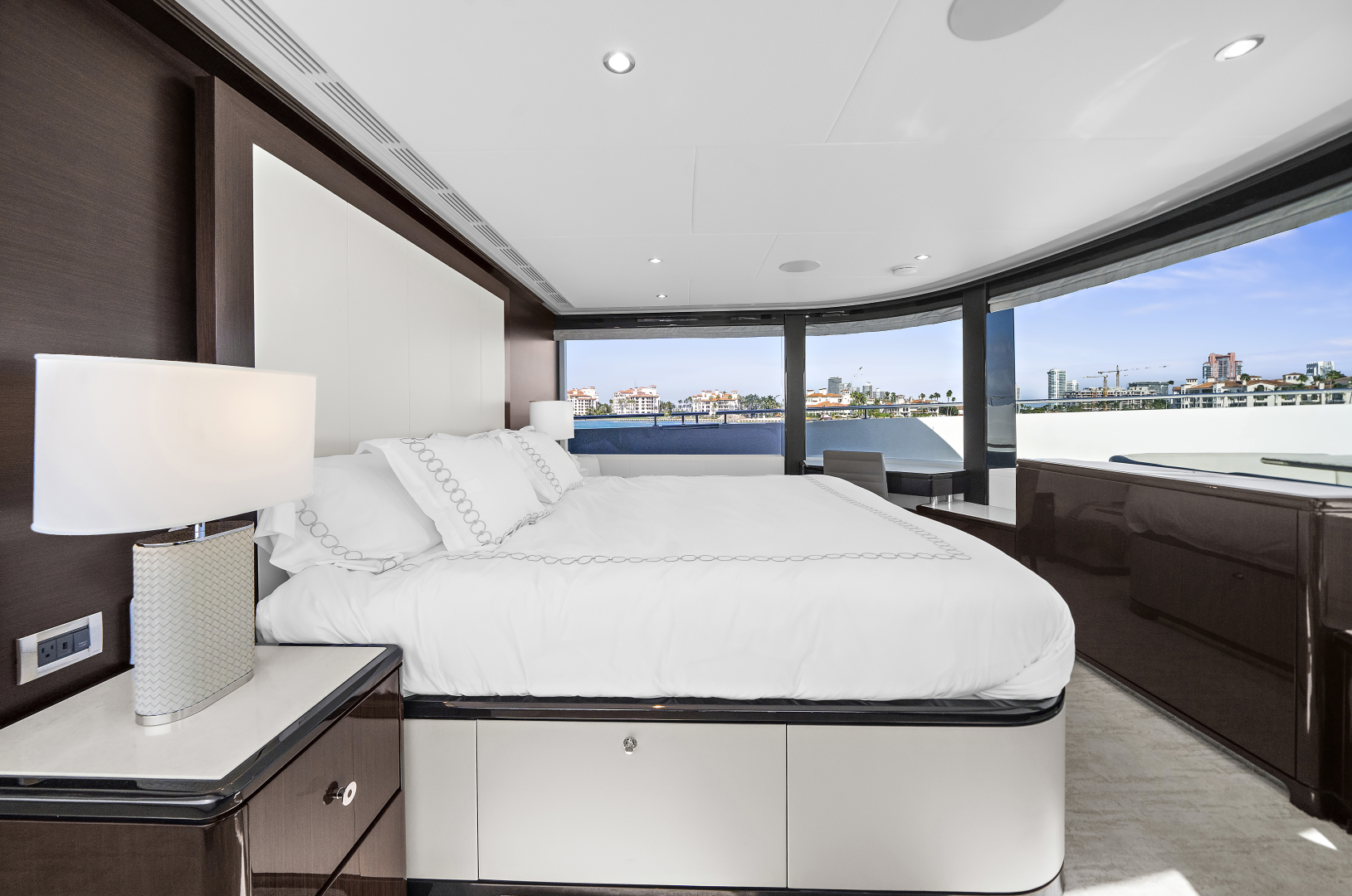 Designed to impress both indoors and out, the 32L offers the Novus Dusk wood interiors along with floor to ceiling windows and a formal dining area. Forward of the dining area for 10 is an oversized galley and day head. The flybridge offers an inviting full beam skylounge with a day head, and exceptional exterior spaces. The bridge deck features a four-person jacuzzi, wet bar, BBQ, and generous seating for entertaining. Powered by Twin MAN V12 1900hp engines and equipped with advanced zero speed stabilization, a full Garmin electronics suite, and robust onboard systems including 50/60hz converter system. “LA-LA-LA” delivers effortless luxury, reliability, and comfort at sea.