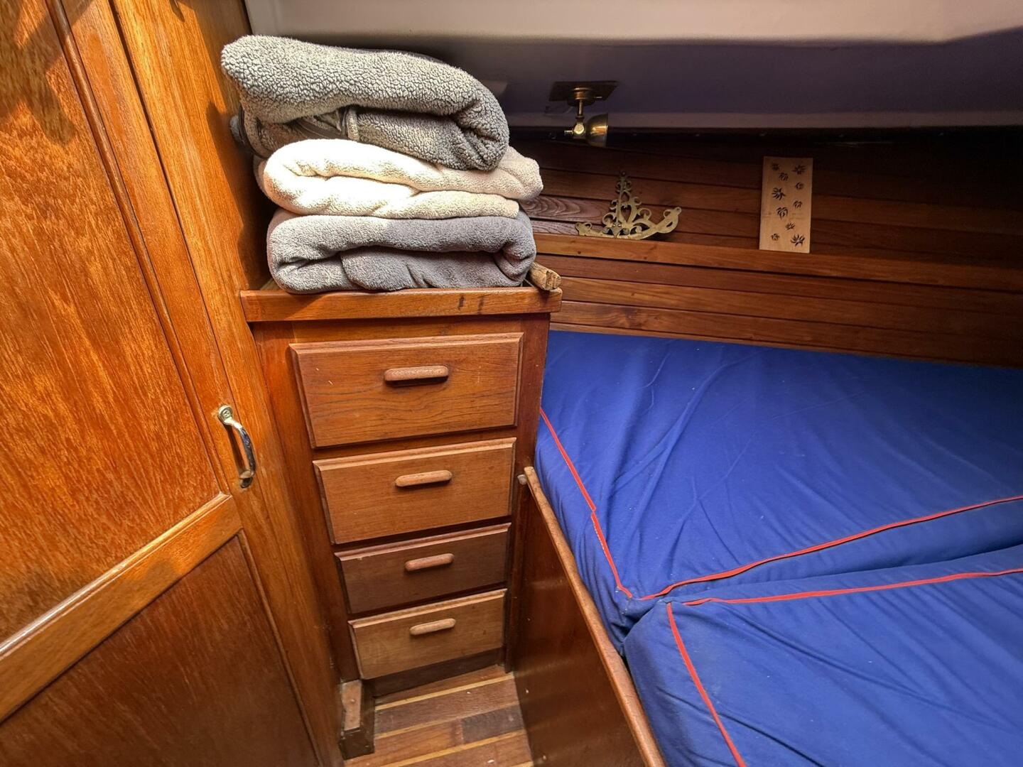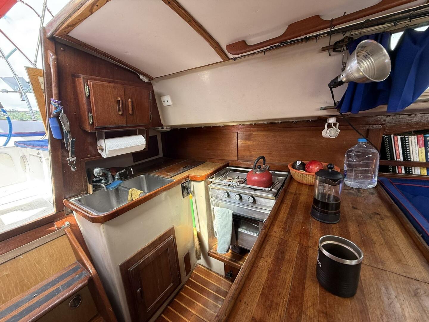 Forward there is a full width V-berth (6’6”). The main cabin has a U-shaped table to port and a couch that is also a double berth to starboard on the opposite side. Further aft are a full chart table to starboard and a quarter berth. The U-shaped galley is immediately to port of the companionway opposite the chart table with ample storage under the forward-facing counter. The boat has varnished teak interior with teak and holly floors, and all cushions have been reupholstered with Sunbrella for easy maintenance.