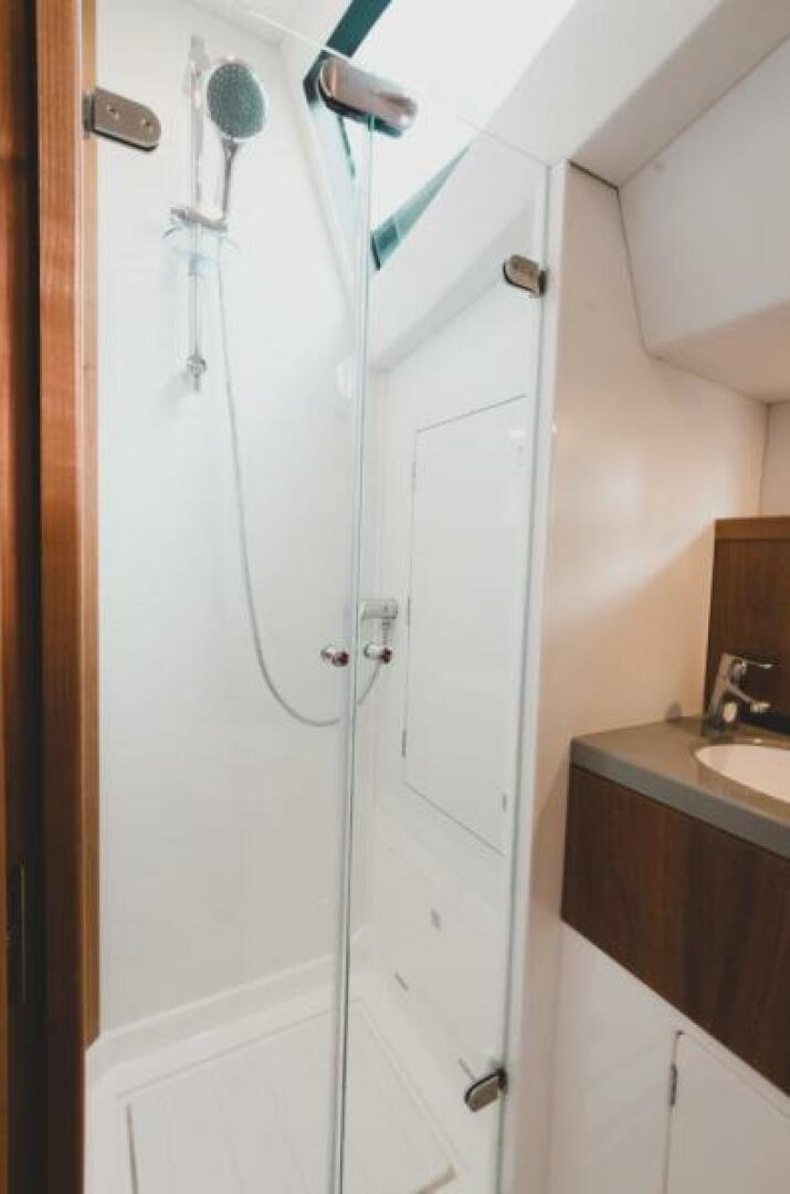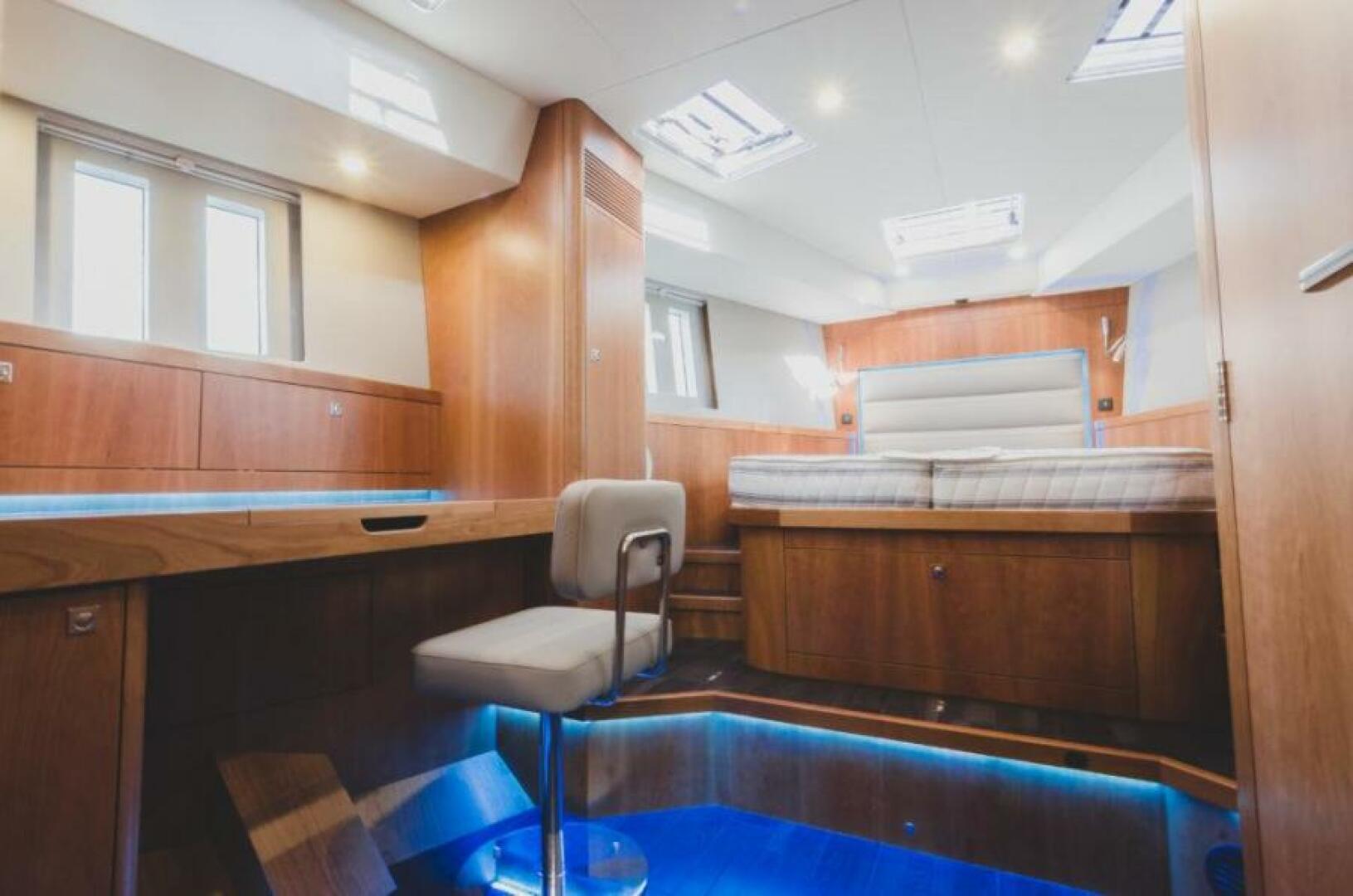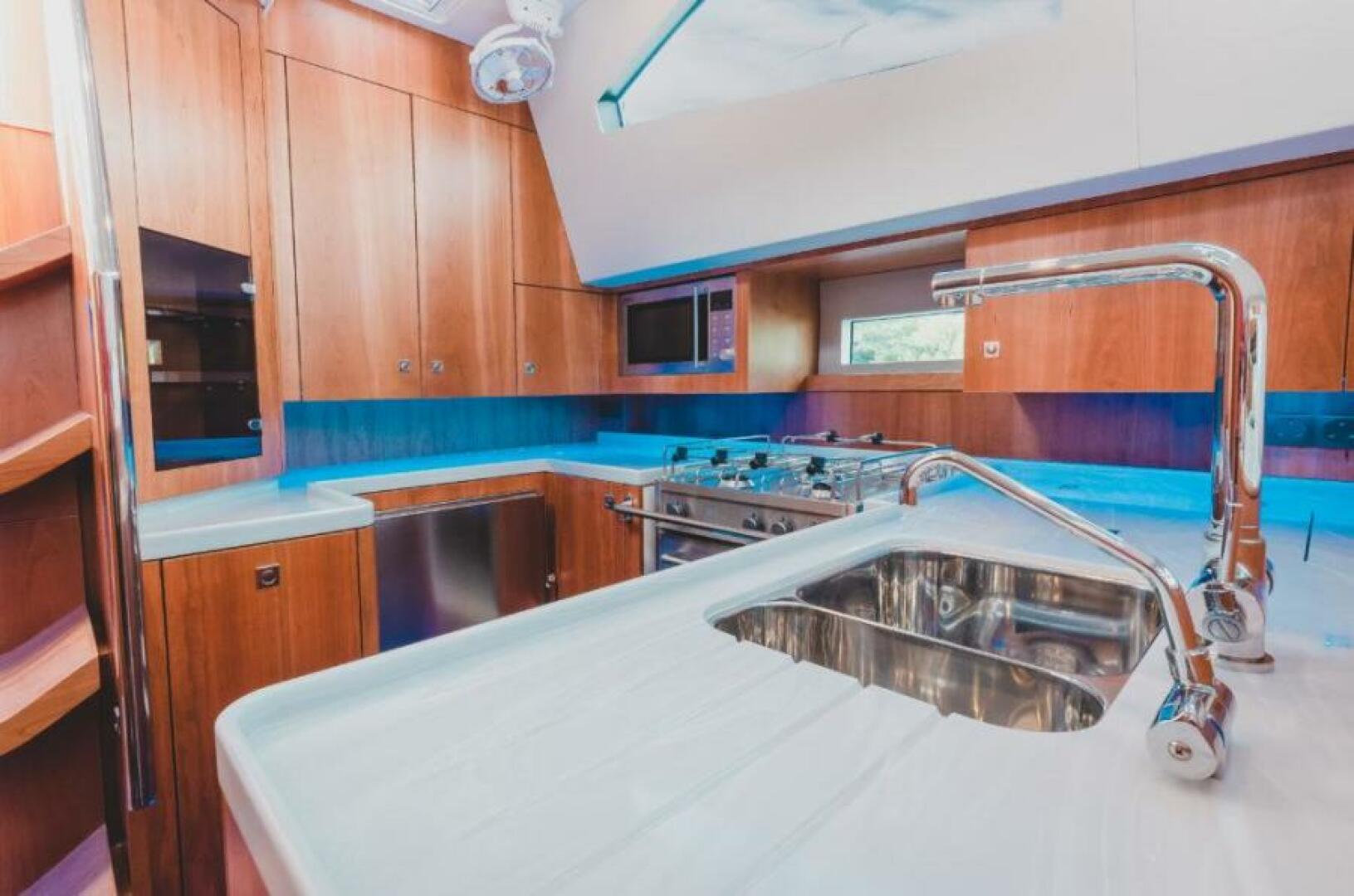The variable-draft system combines performance with true shoal-water capability. Fixed ballast is provided by an iron casting that serves as both a grounding plate and structural reinforcement for the keel housing, secured within a dedicated hull recess by stainless steel bolts. The aerofoil-shaped swing keel is cast iron with a stainless-steel pivot at the leading edge. Hoisting and lowering are managed by a Dyneema pennant and hydraulic ram, powered by an electric pump with manual backup. All hydraulic components are positioned for straightforward access and service. Keel controls and a position gauge are located at the helm, with additional electric and manual controls at the keel station. A stainless-steel locking pin secures the keel in the raised position.