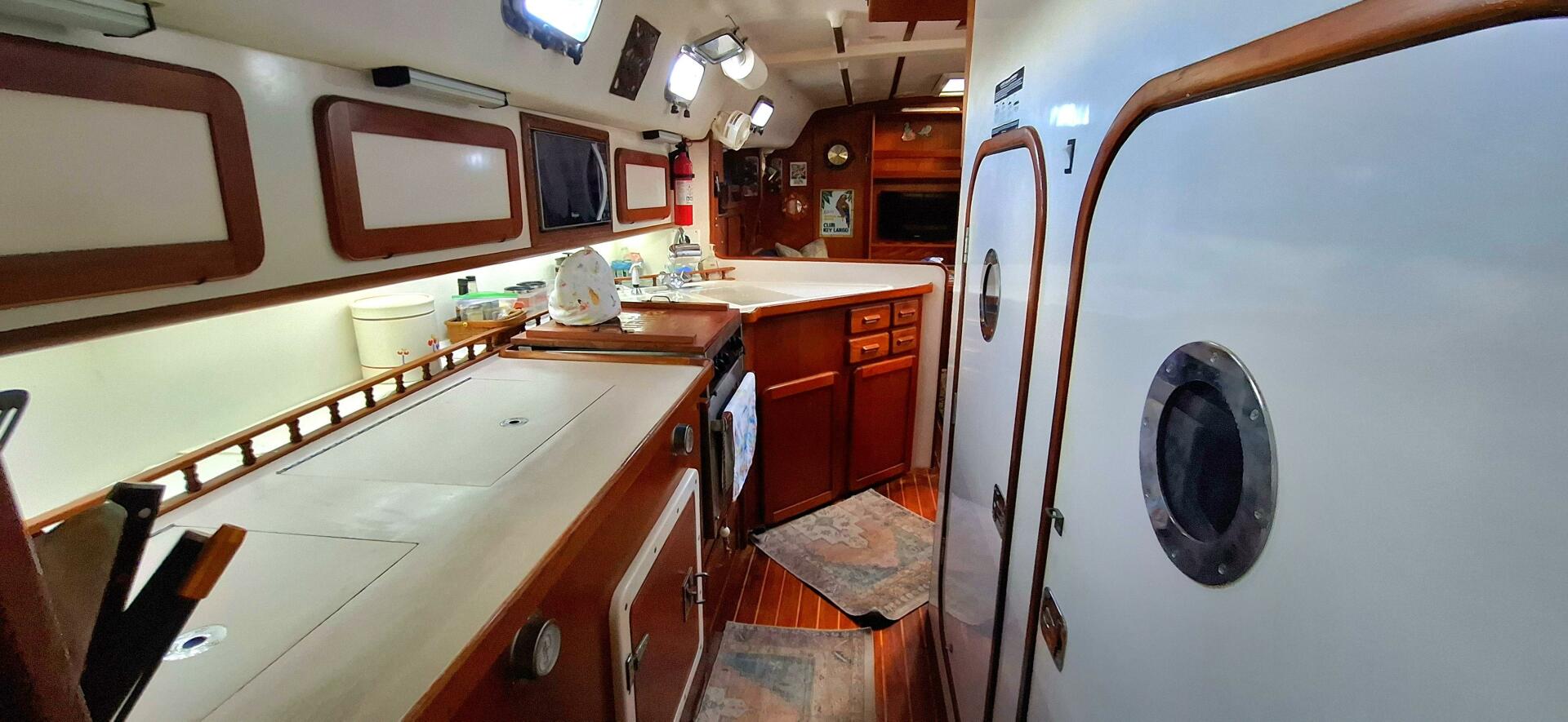 The galley is equipped with a three-burner LPG stove with oven, built-in microwave, dual refrigeration including a 4.3 cu. ft. dual-loading refrigerator and a 3.5 cu. ft. top-loading freezer with heavy insulation, plus a large double sink and extensive locker and drawer storage throughout. High-efficiency insulation and premium two-part foam fill maximize cooling performance. A handcrafted teak interior with solid joinery, teak-and-holly sole, and soft headliner adds warmth and elegance, complemented by 26 opening ports, hatches, and deck cowls for excellent cross-ventilation throughout all cabins. A dedicated forward-facing navigation station includes a chart table, storage, and electronics mounting panels, and a dedicated engine room—separate from the living quarters—provides improved noise isolation and additional interior storage.