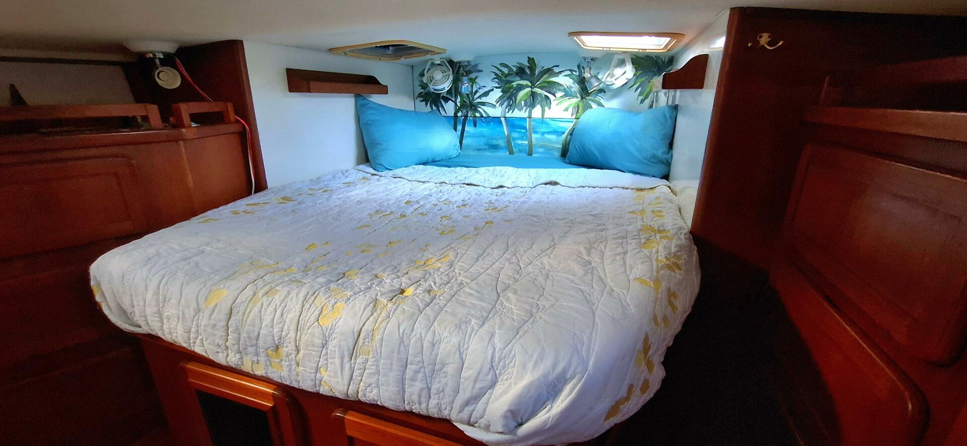 Two private staterooms each feature an ensuite head with a separate enclosed shower stall, Plexiglas doors, and built-in shower seating. The forward shower has been converted to a shelved storage area but can easily be returned to full service. The aft master cabin offers a queen-size island berth, dual cedar-lined hanging lockers, two dressers, and multiple overhead hatches and ports that provide excellent light and ventilation. The forward Pullman-style berth includes extensive storage with drawers beneath, lockers above and below the vanity, and additional shelving throughout.