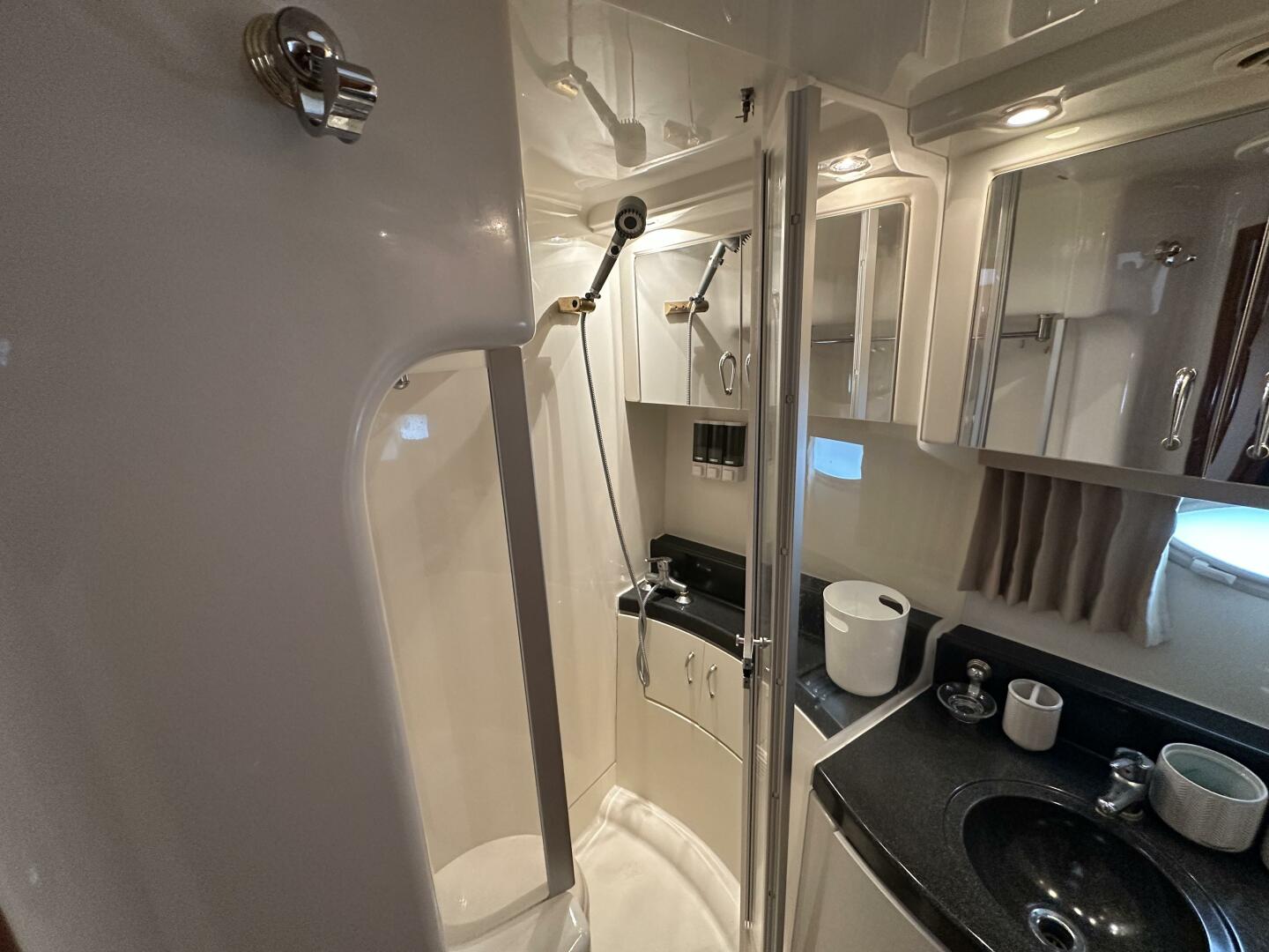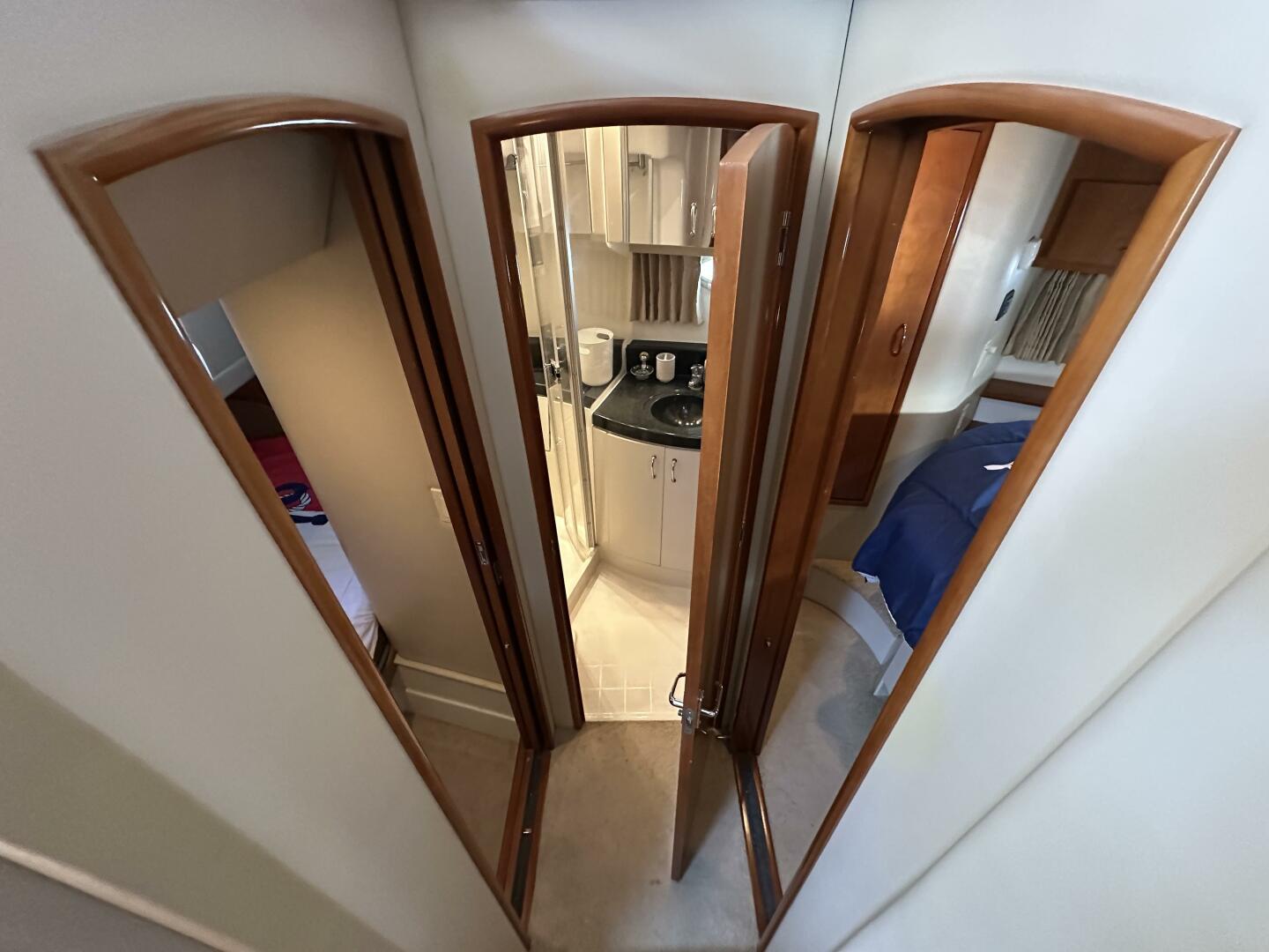Unlike cramped mid-cabin designs, this vessel offers two genuine private staterooms and a clever split-head arrangement.