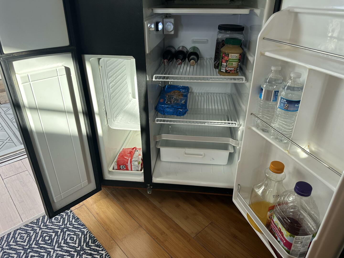 - Appliances: Features a recessed two-burner electric cooktop, microwave/convection oven, refrigerator/freezer, ice maker, and a central vacuum system.