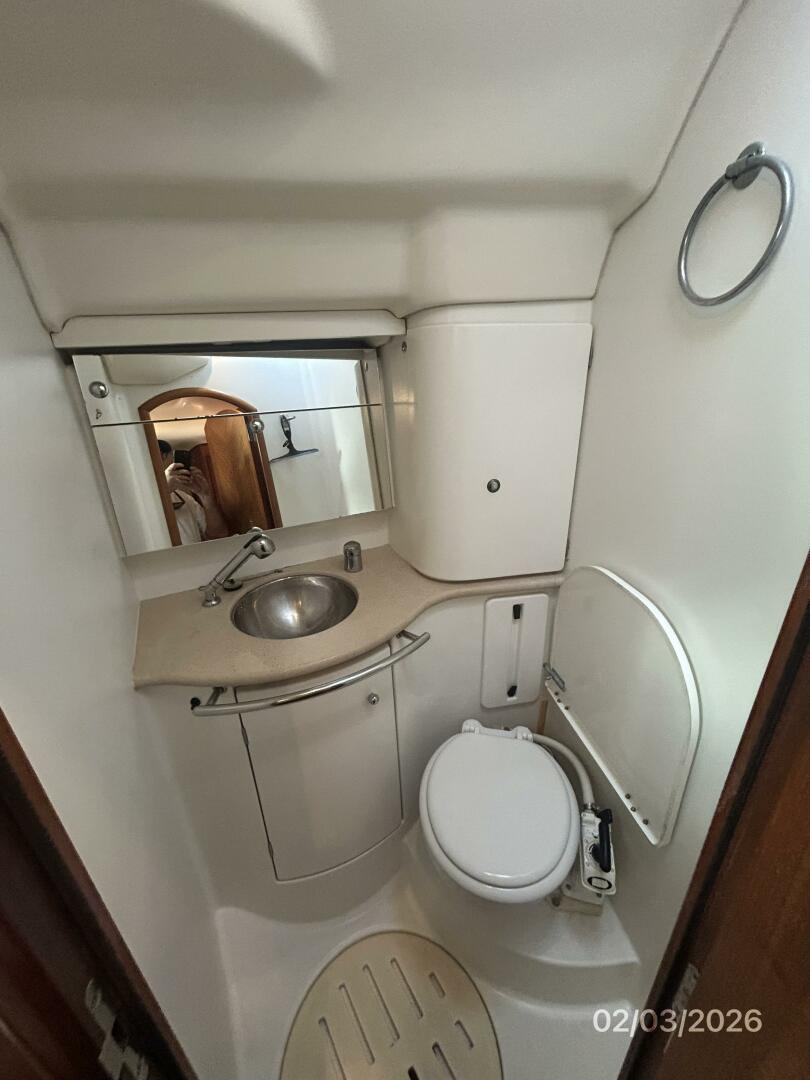 The forward stateroom offers a v-berth, shelves, hanging locker, overhead hatch with an Oceanair shade, fan and a laminate teak & holly sole. There is a head port forward in the salon.
