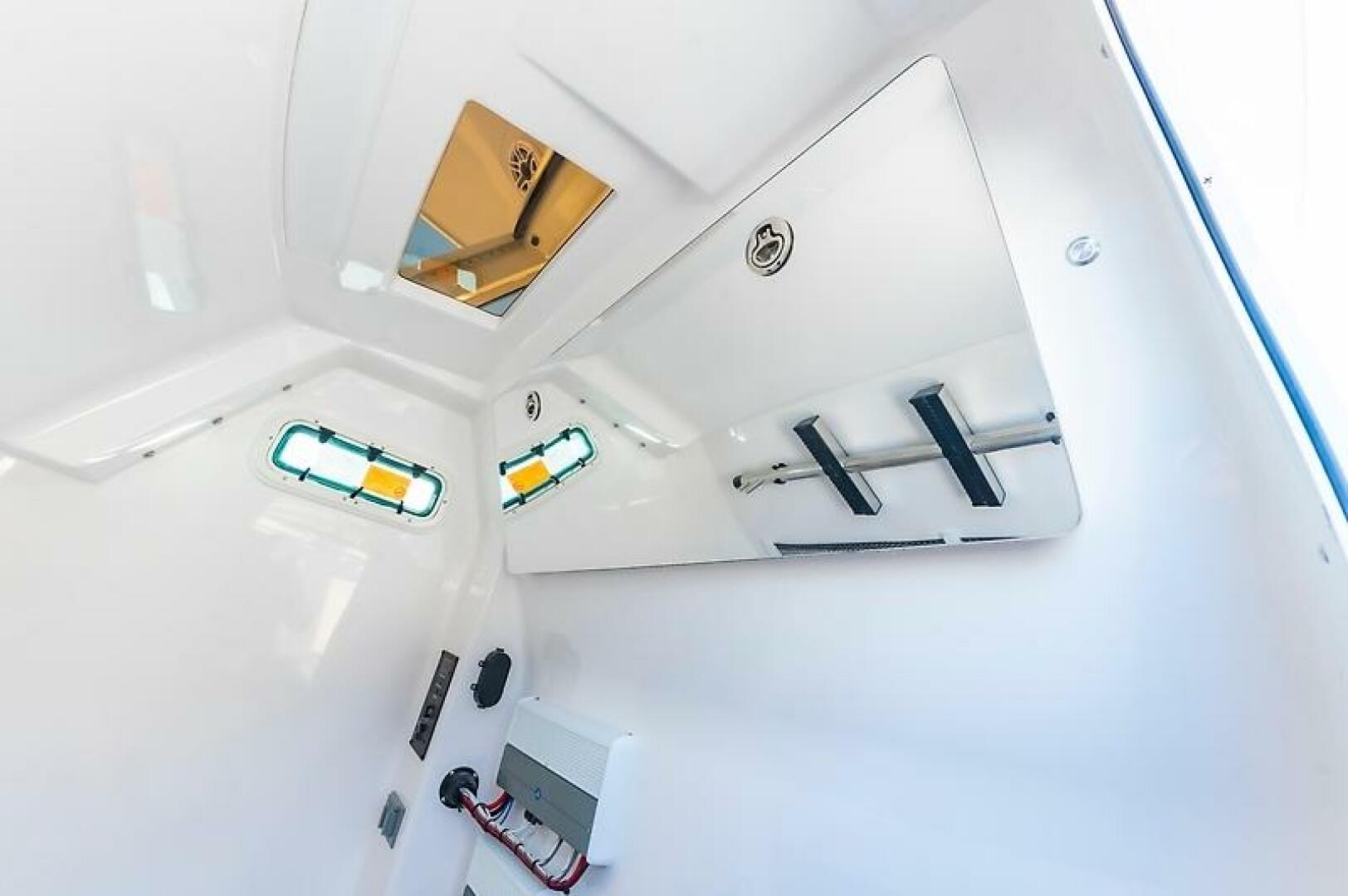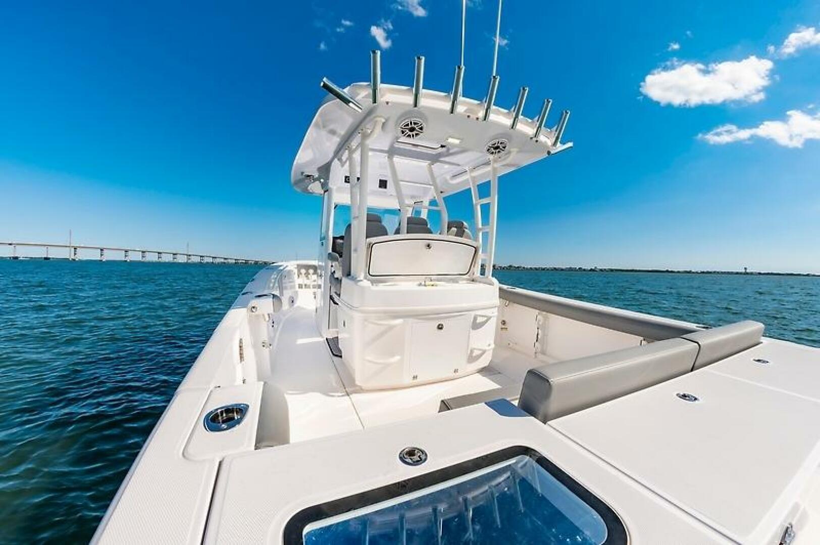 - Fiberglass hardtop with aluminum powder-coated frame includes LED lights, spreader lights, electric sliding windshield, electronics box, (5) rod holders, a set of kingfish rod holders