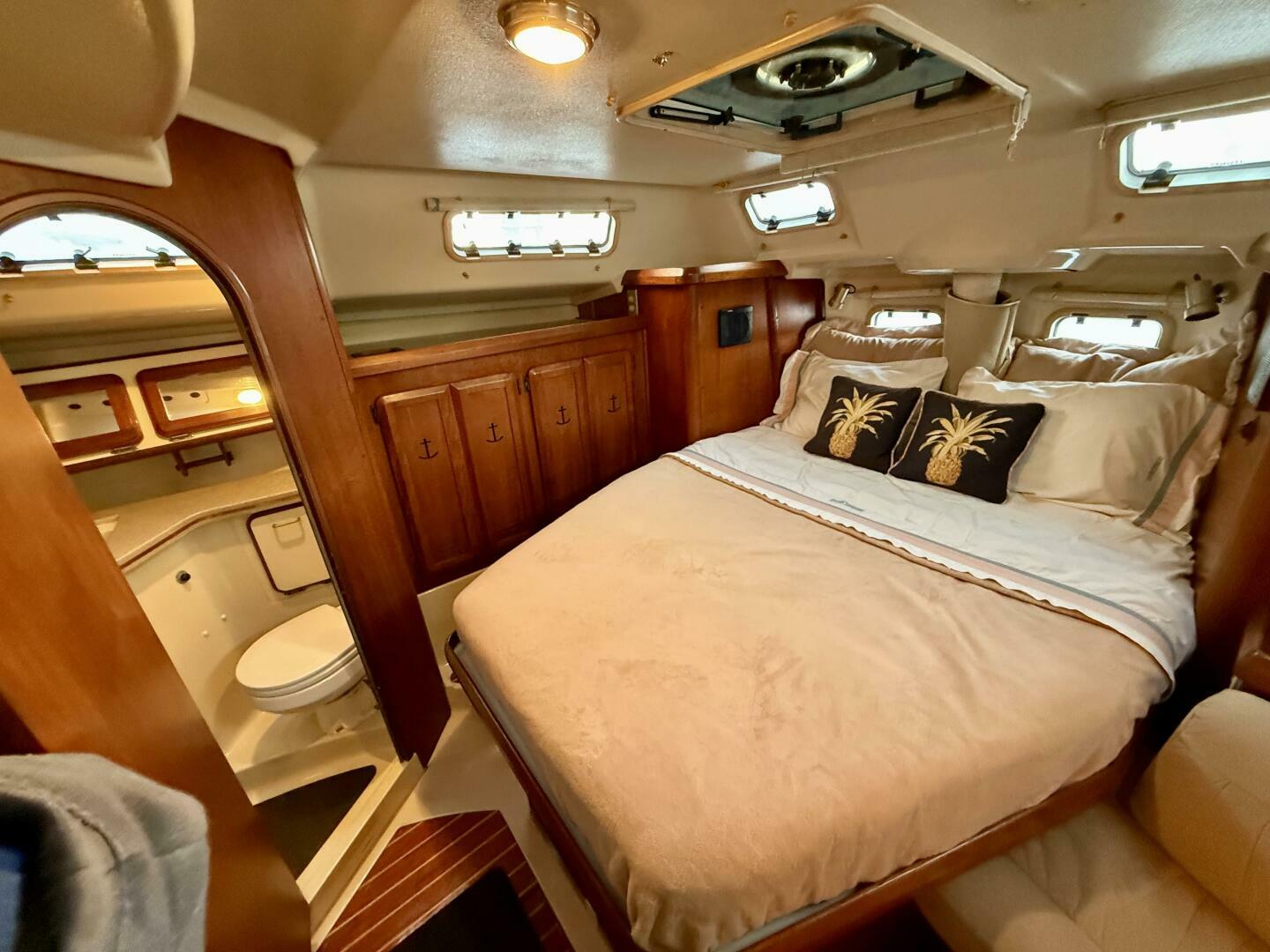 - Forward guest stateroom with large V-berth and generous locker space
