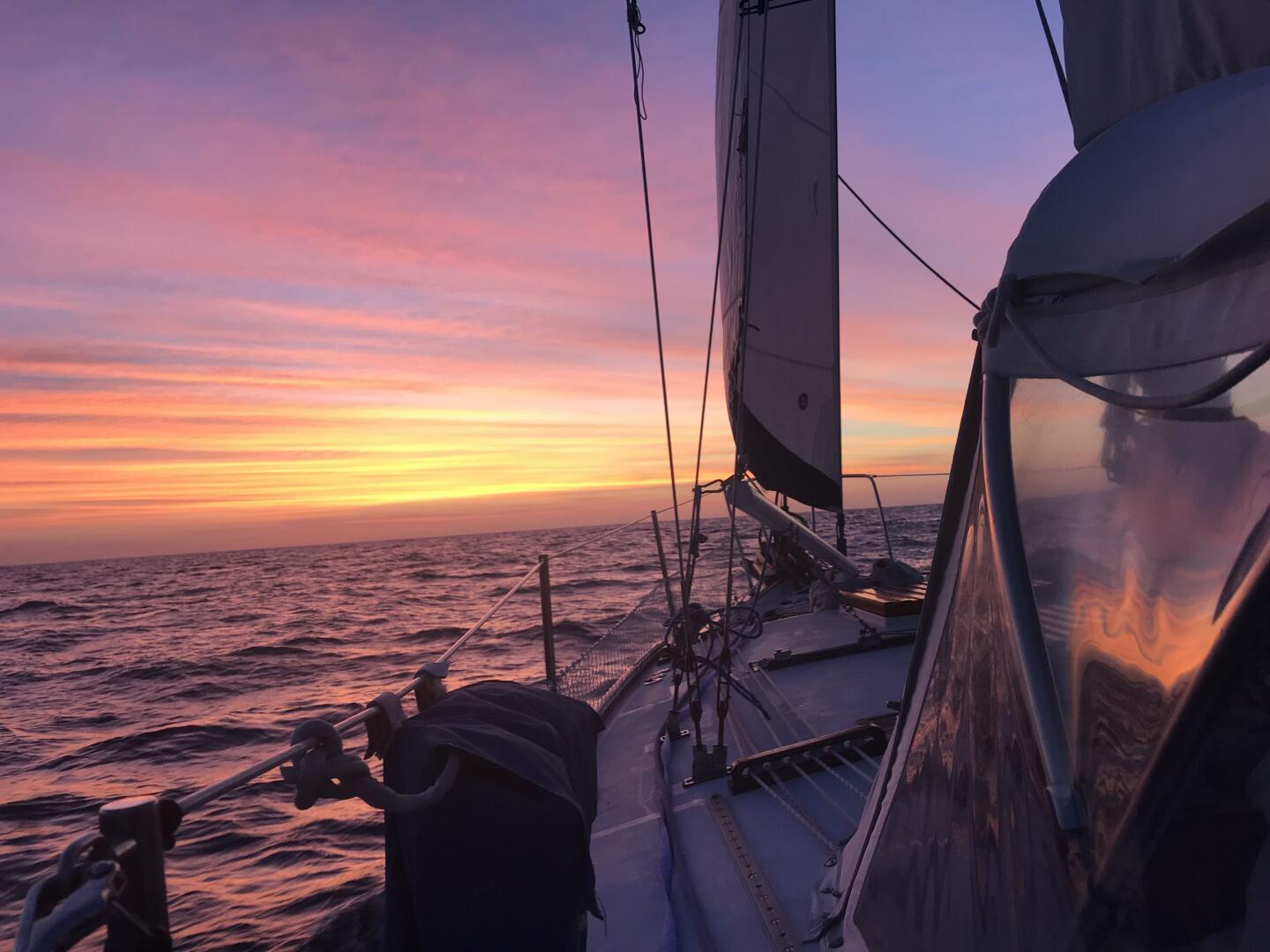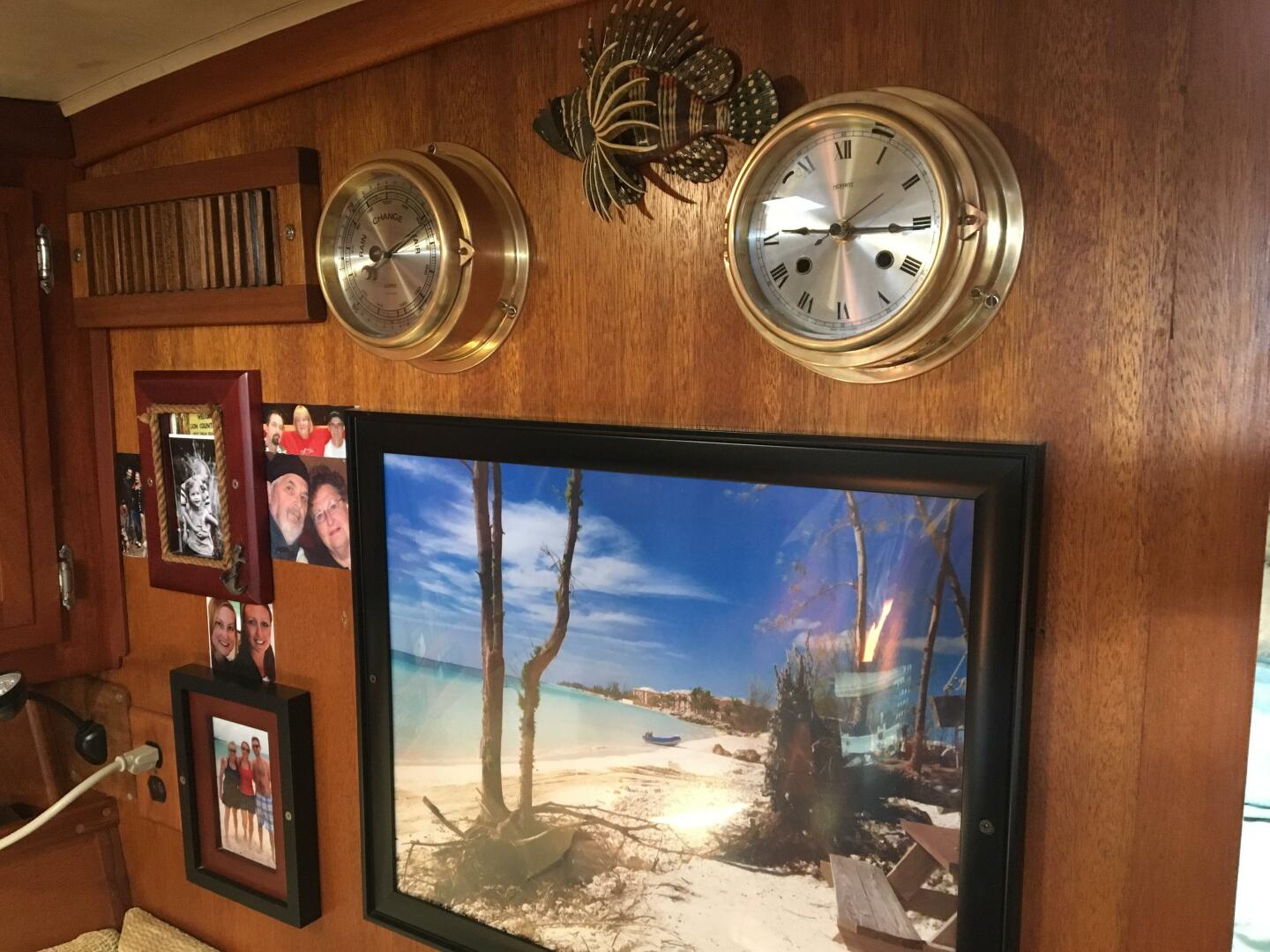 Because of her flush deck and design, you will not find another boat of this size and price with as much space below with an aft cabin for 2 people with private access to the head. We love her large cockpit as it’s more like another room with an over-sized dodger and full curtains to keep those bad days outside. She handles docking very well with her prop walk in reverse, which is offset by her large stern hung rudder. The mechanics of steering being under the rear seat in the cockpit means you’ll NEVER have to crawl under a bunk or locker to access a steering quadrant or issue. Because the rudder is hung off the stern you can back her straight for any distance you want or need. Because of the keel, prop walk and rudder design she can be turned around inside her own length if needed. Piloting her from the very large cockpit is very comfortable with all her instruments and big wheel. Because the companionway is not centered but offset you will look straight out from your station through the dodger opening with great visibility. I will miss piloting her the most.