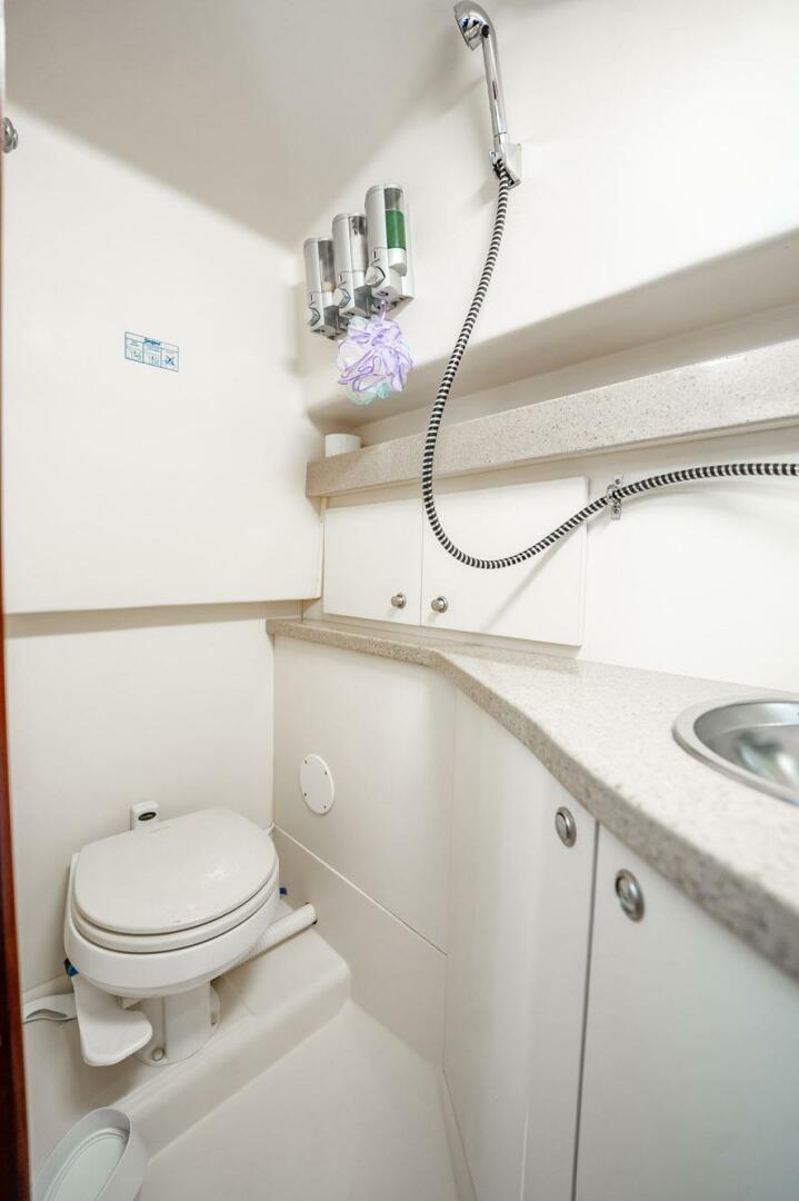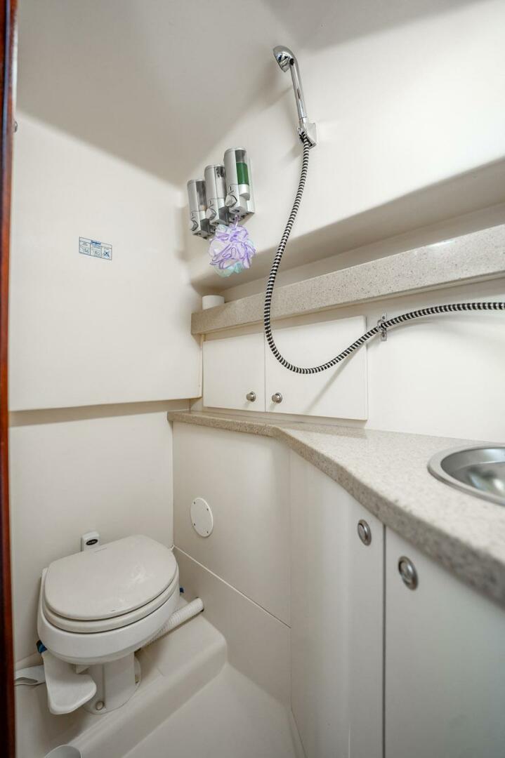 The interior of the 320 Open features rich fabrics and fine hard woods accented by durable, yet beautiful Corian. The forward V-Berth doubles as a dinette and the starboard settee flips up and slides out to offer a double berth below with a single above. Galley accommodations include a two-burner range, dual-voltage refrigerator / freezer, and microwave. The full-fiberglass head with shower is large and easy to maintain with a Corian counter and plenty of storage.