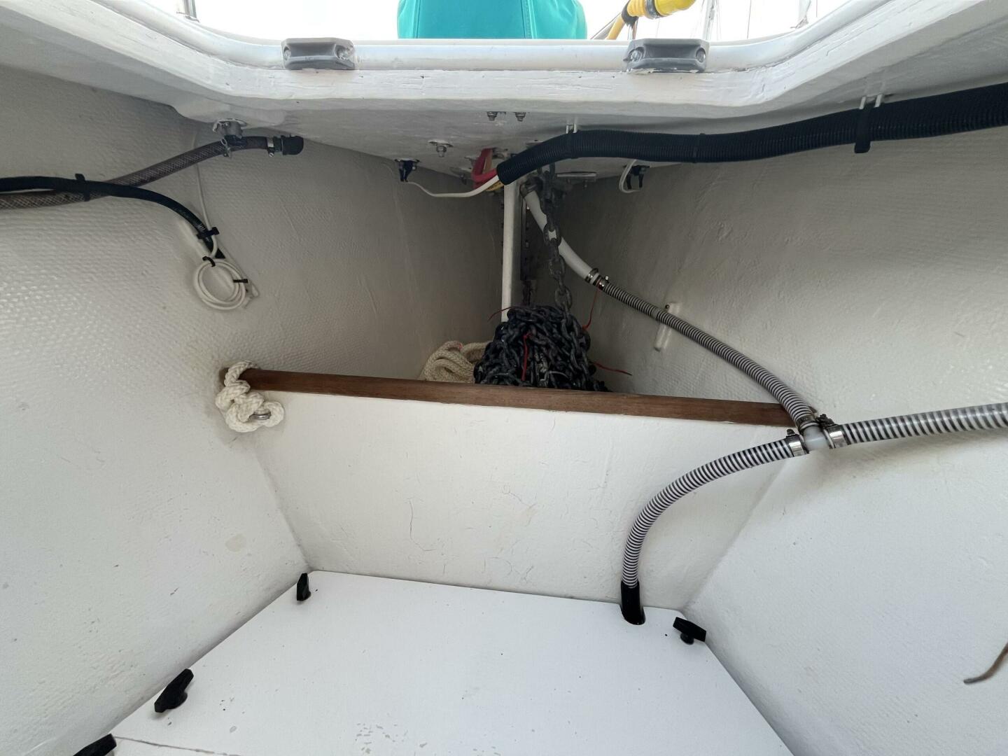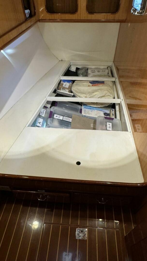 Excellent stowage and load carrying capacity are designed into all aspects of the Outbound's hull and deck. Large water and fuel tanks are below the salon cabin sole and over the keel which adds to the boats upwind performance and opens up space under the settees and bunks for stowage. There is a large foredeck locker located forward of the watertight bulkhead that easily accommodates sails, dock steps, fenders anchors, or any cruising gear you want to keep out of the living spaces. The locker also offers access to the chain locker and makes setting and stowing the asymmetrical spinnaker a breeze. The bow thruster and its battery bank are also located in this locker. In addition to the forward locker there is a giant cockpit lazarette, a large propane locker and room for the life raft under the helm seat for easy deployment.