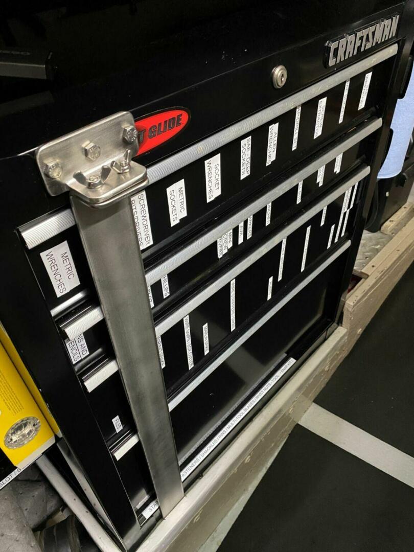 Craftsman heavy duty 4-drawer tool chest in workshop, securely fastened to shop sole and centerline bulkhead (2022)