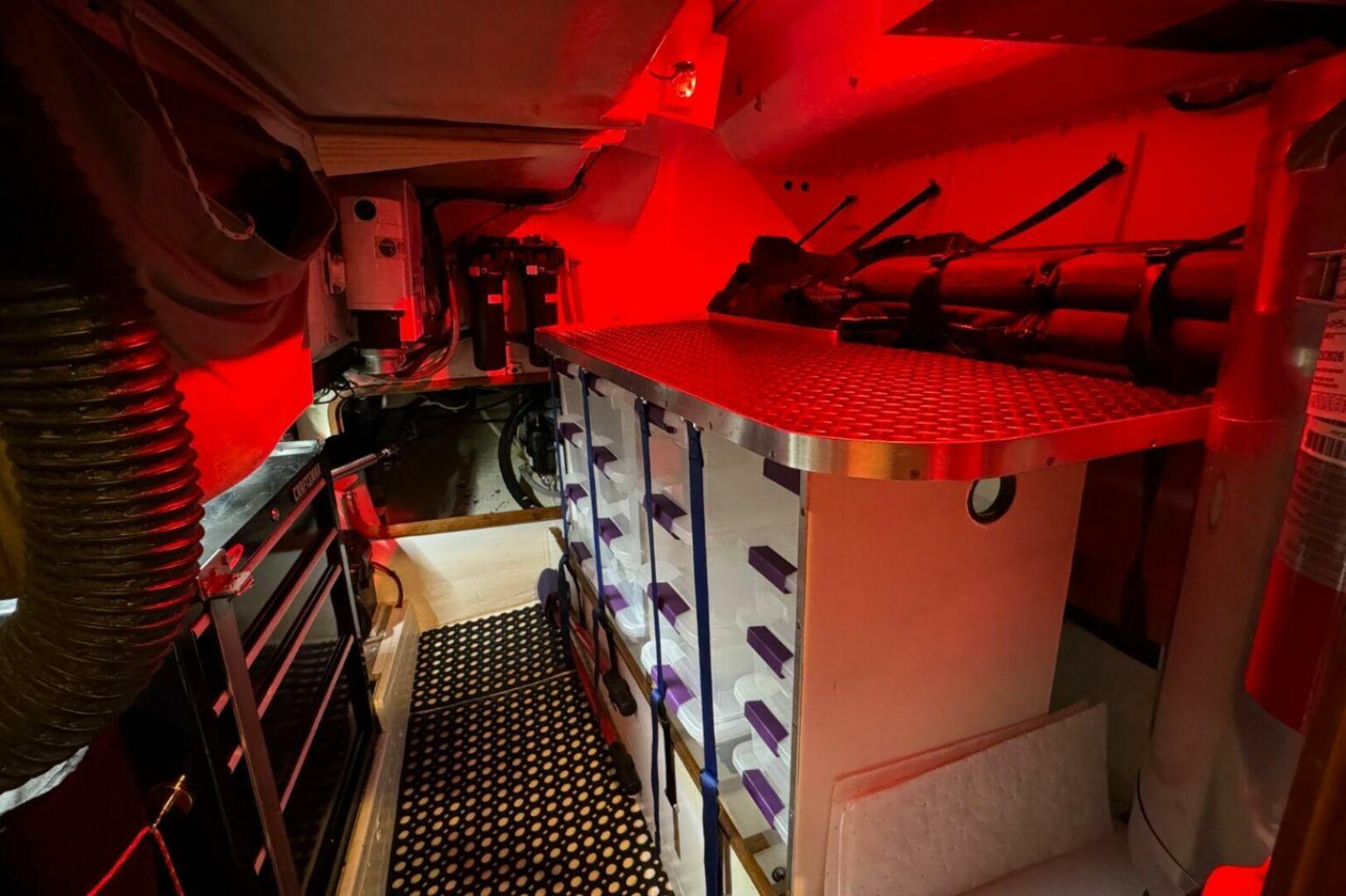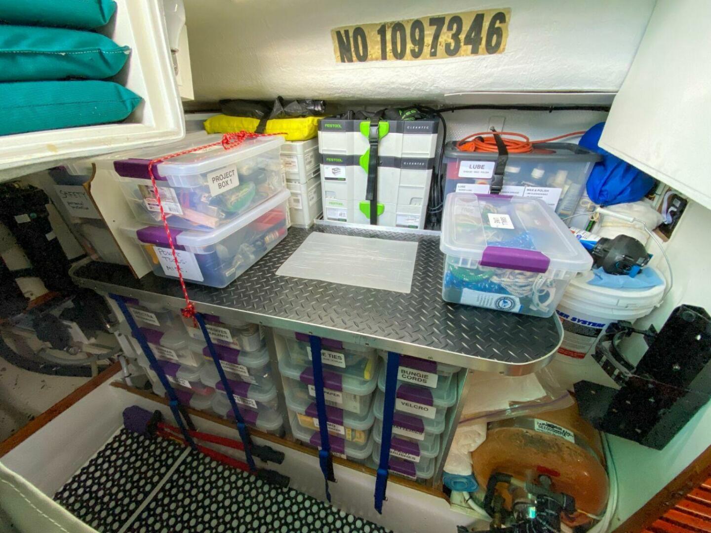 Shop/Garage: One of the Outbound 44’s hallmarks is exceptional systems access, and JOURNEY HOME exemplifies this. Aft of the nav station is the shop with custom work bench and tool and spare parts solutions, plus access to major systems like the watermaker, hydronic heating system, water heater and fresh water pump, autopilot and steering gear and fuel filters. A hatch opens into the cockpit, providing headroom and good ventilation. The space is well lit with white and red LED lights.