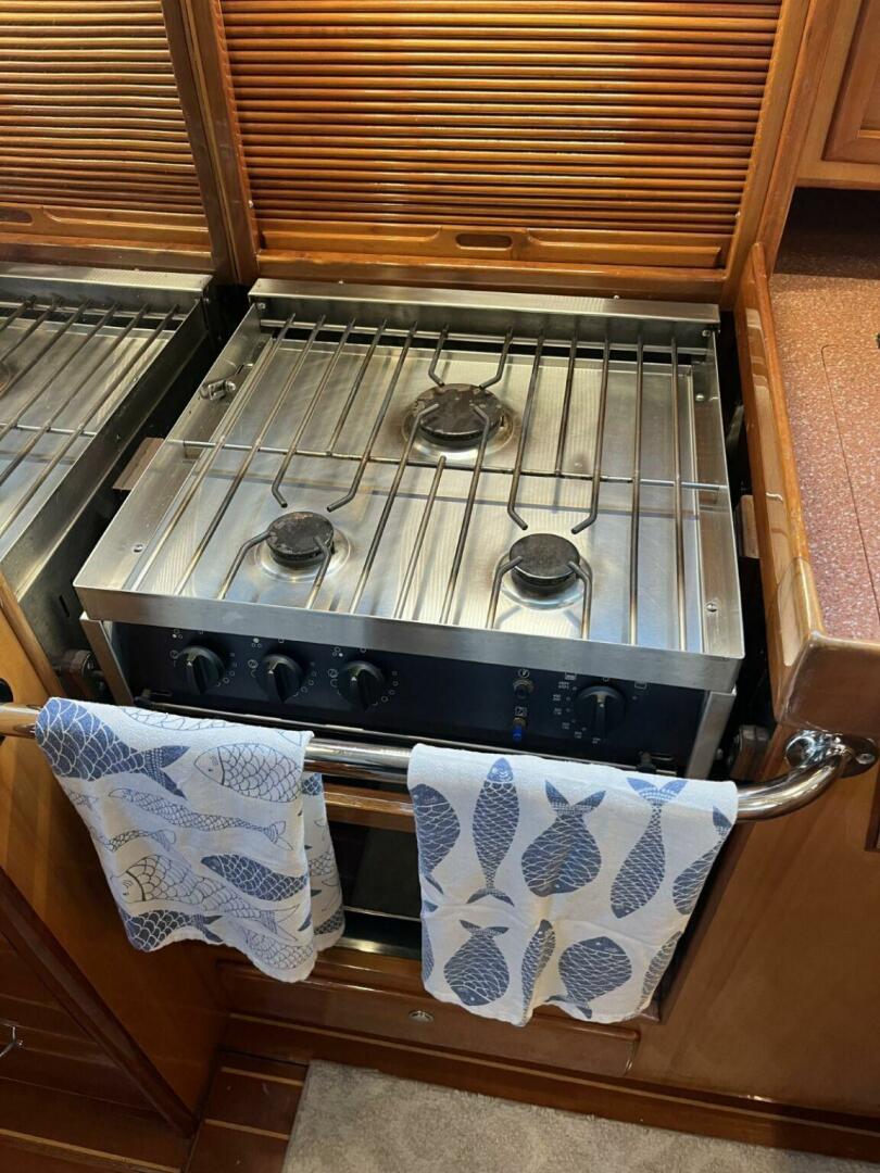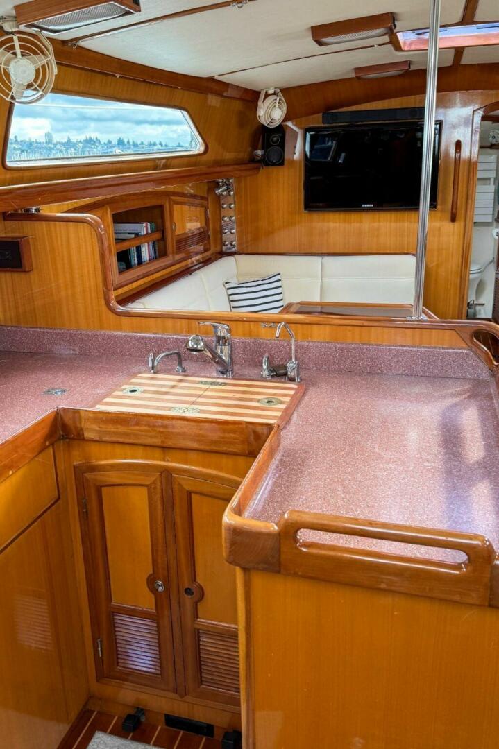 Galley: The U-shaped galley to port at the base of the companionway is secure and efficient under sail. Corian countertops provide ample workspace around the double stainless steel sinks, three-burner Force 10 propane stove with oven, and top loading refrigerator/freezer. Multiple drawers, lockers, and deep bins keep provisions organized and secure. The location ensures good ventilation from the companionway and excellent communication with the cockpit—ideal for offshore or liveaboard use.