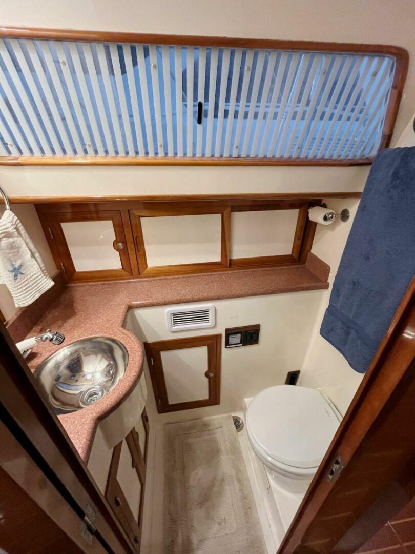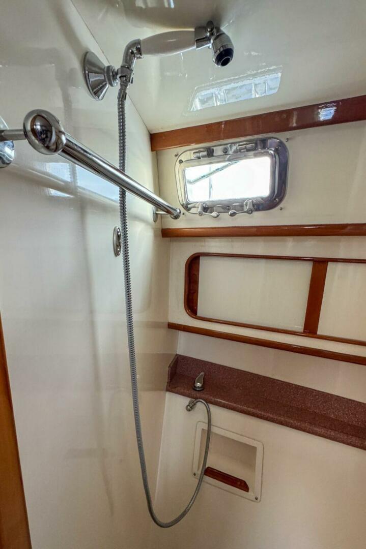 Forward Head: Just forward of the Pullman berth, the forward head is designed for comfort and practicality at sea. It includes a separate shower stall, a Corian countertop vanity, electric marine toilet, and multiple lockers for toiletries and linens. The space is warmed by a heated towel rack via the diesel fired hydronic heater.