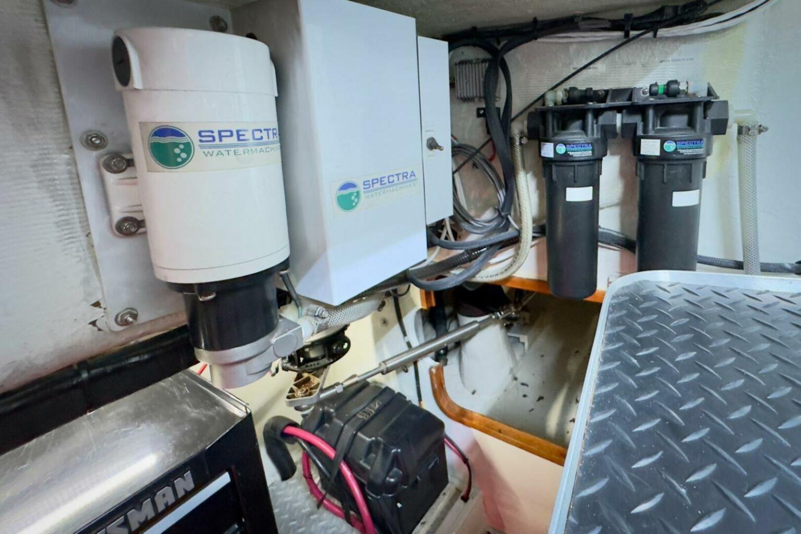 180 gallons of water, along with Spectra MPC300 water maker, provides independence at anchor and underway
