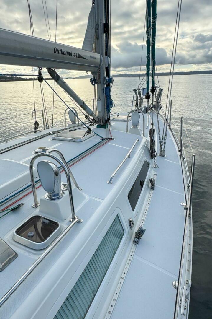 The hull of the Outbound 44 is designed and engineered for serious offshore cruising. The hull is constructed of solid hand laid fiberglass laminate with a massive system of stringers, longitudinals and bulkheads that are carefully bonded directly to the hull while it is still in the mold. Laminates are increased in high stress areas and in the bow and bilge for added strength. Vinylester resin is used in the outer layers of the hull lamination. To eliminate keel bolts and for maximum strength, the keel is integral to the hull. The rudder is a carbon fiber spade with PYI/Jefa bearings and is supported in a strong tube. After the deck is through-bolted and sealed to the hull with 3M 5200 polyurethane sealant, the bulkheads are fiberglassed on their entire perimeter. All furniture is then carefully bonded to the hull, adding to the structural support system. The deck is cored with balsa and where hardware penetrates, the core materials are replaced with solid fiberglass. There are removable overhead panels at all deck hardware locations. The pushpit and pulpit are 1-1/2" diameter stainless steel connected by double lifelines with gates port and starboard. Solid handrails extend from the pushpit to the midships gates to assist cockpit exit and entry. There are stainless steel grab rails along the coach top, a custom stainless steel double anchor roller, and six stainless steel 12" mooring cleats.