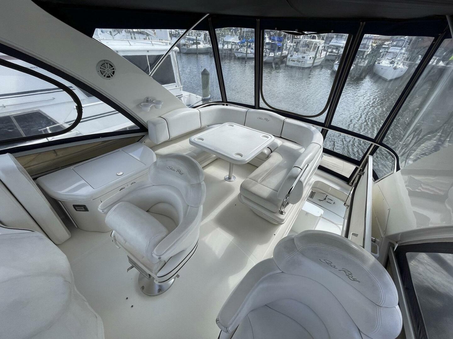 Still Waters is a 44 Sedan Bridge that combines effective use of space with luxurious accommodations. Sea Ray is well known for its Sedan-Style designs, and the 44 will not disappoint, Wood floors, Oversized Windows, and plush Ultraleather Sofas are just a few of the luxuries found in the spacious cabin. A raised dining area provides a panoramic view, and Deep-Pile carpeting and beautiful cabinetry highlight the decor. Below, a guest cabin to port has twin single beds, while the forward master stateroom features a Queen-Sized island berth. Both head compartments are fitted with Vacu Flush and separate showers. A sliding glass door opens to the cockpit with a walk through transom, hydraulic swim platform, bench, seating, and molded flybridge stairs. Offering good visibility fore and aft, the extended flybridge includes a large U-Shaped aft seat with removable table. Engine Cooler and Service Done. Turn Key and Ready to Go.
